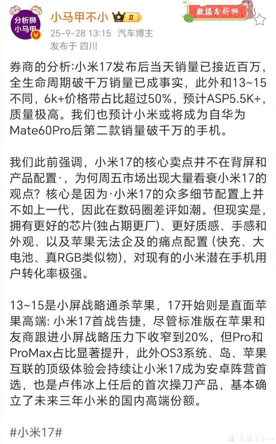 关于小米17系列生命周期内销量究竟能不能突破1000万台的结论却不同