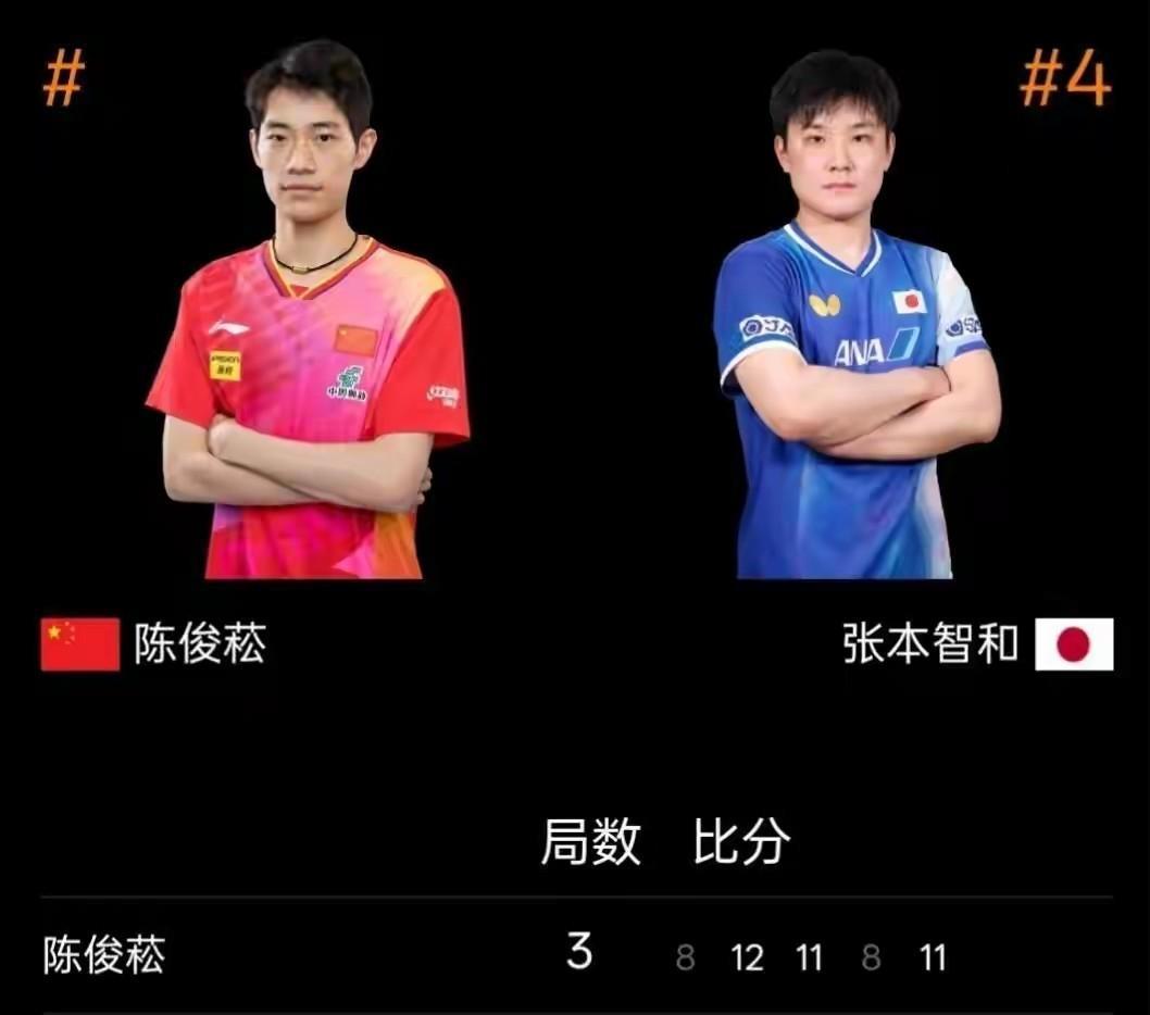 WTT中国大满贯男单比赛,主场作战的中国球员状态爆棚,惊喜连连!从资格赛突围的20岁小将陈俊崧以3:2逆转绝杀张本智和,前四局两人以8-11、12-10、11-8、8-11战平,决胜局张本智和9:5领先,被陈俊菘连得6分实现超级大逆转,这位世界排名仅第111位的小将爆冷“拆摩托”成功!陈垣宇苦战五局,以13-11、4-11、11-7、3-11、13-11险胜德国老将奥恰洛夫,袁励岑以11-9、13-11、11-4三局完胜瑞典名将安东·卡尔伯格,林诗栋轻松击败普卡。
