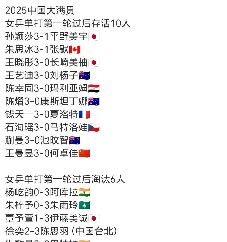 9月29日中国大满贯首轮比赛,女单竟然没有男单总体成绩好,意料之外。 女单:16名运动员参加第一轮正赛,10人晋级,6人淘汰。 男单:13名运动员参加正赛第一轮,9人晋级,4日人淘汰。 看着女队10人晋级好像比男队9人高,但是人数还是差3人。女队小将还是得好好磨练,男队这次第一轮还是发挥很好的。温瑞博属于内战。何卓佳也是内战没办法的事情,总有一个得出局。 第二轮出局的有可能更多,但是绝对主力还是很靠谱的。 孙颖莎,王曼昱,陈幸同,蒯曼,王艺迪都没问题。 男队王楚钦,林诗栋,梁靖崑VS林高远只能留一个。其他都不好说。 这样一看还是女队有优势更大一些。