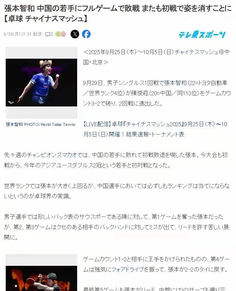 张本智和2-3被陈俊菘淘汰出局,没想到日本媒体竟然说:“张本智和打中国选手经常出意外!” 随着张本智和再次遭遇一轮游,日本媒体也是第一时间发表对张本智和的看法,媒体认为,张本智和和中国选手打比赛经常出现意外,不得不说日本媒体看的非常的透彻。刚刚结束的澳门冠军赛和正在进行的北京大满贯,张本智和都是遭遇一轮游,巧合的是两个一轮游都是败给了中国选手。 在澳门大满贯输给了薛飞,在北京大满贯输给了陈俊菘,不得不说,我国乒团真的是后继有人,尤其是面对日本选手从来不手软,能够淘汰张本智和真的是太解气了,更加解气的是陈俊菘赛后一席话:“张本智和赢完王楚钦之后比较嚣张,今天赢下他之后能够帮助中国队提升士气。” 从日本媒体所说的那样,我们不能看出张本智和打球一点儿都不稳定。他经常输给我国的新型球员,这一点来看张本智和个打球灵活性不强。另外他还经常输给自己国家的队员,就这样的状态还放豪言壮语要夺得北京大满贯冠军,真的是可笑!#张本智和# #张本智和表情包#