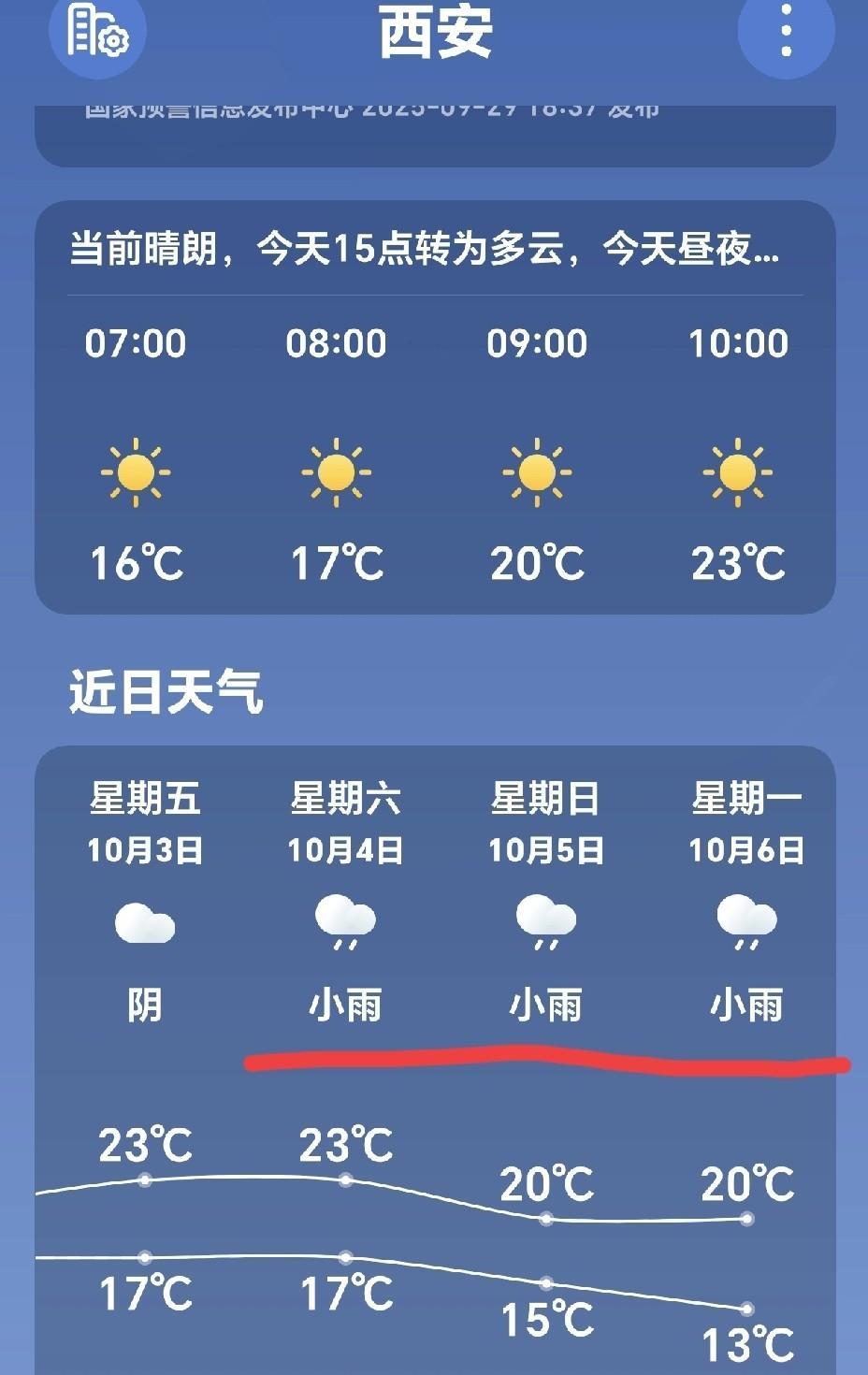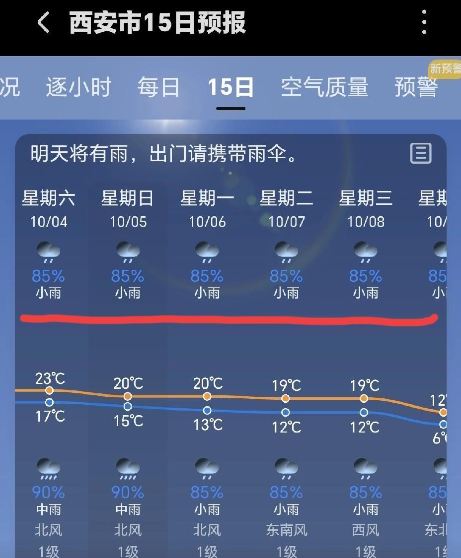 今年的国庆中秋虽然是历史上最长假期,但西安国庆节期间的天气让人扫兴! 今天已经是国庆中秋假期前最后一天上班了,有些有出行旅游计划的人,下午就开始上高速坐高铁,加入车山人海队伍了。 西安从昨天开始这两天天气好晴朗,但从明天凌晨开始又是中雨,除2、3号是阴天外,从4号开始一直到15号都是小雨天气,这将给出行旅游或来西安旅游的人们带来诸多不便。无论是开车赶路,还是在景区步行游览,小雨天气都给人们增添了麻烦,尤其是带小孩坐幼儿车的游客,更是一种不好体验。 我记得,自从国家拉动内需,实行长假制度以来,好像北方大多数的国庆节都在阴雨绵绵中度过。 今年的天气异常是多年没有的,春夏伏天高温干旱,到秋季阴雨连绵,下个不停。雨水的分布太不均匀,这除了给人们生活带来诸多不便的同时,也对农作物生长和收获极为不利。 大家对西安天气异常怎么看?形成这种气候异常的原因是什么?#西安天气# #西安早晨下雨# #西安魔幻天气# #西安怪天气# #西安天气预报#