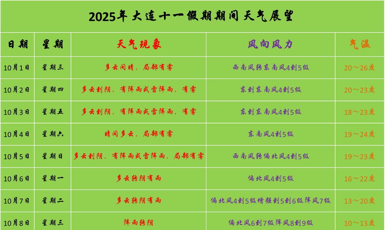 十一假期期间天气总体不是特别给力,天气以多云天气居多,不过也会偶见阳光。受短波槽和副高边缘水汽影响,阵雨频繁,但前中期的降雨基本都是阵雨,不会一下一整天,降雨的不确定性很大,特别是越往后的天气准确性低,建议关注临近的预报信息。假期前中期的气温比较稳定,不会有明显的起伏,白天气温稍高,早晚略凉,注意合理调整着装。假期的后期有一股实力强大的冷空气,届时气温降出现大幅下降,但影响的时间可能还略调整,注意留意临近的预报信息。 假期第一天天气多云为主,最高气温在26度附近,白天时段略有些闷热; 2号凌晨到白天或有阵雨或雷阵雨,长期出行带好雨伞,注意关注临近的雷达信息,白天最高气温在23度附近; 3号依旧是多云有阵雨的天气,最高气温在23度附近; 目前来看4号难得的好天气,晴间多云的天气,最高气温在24度附近,较为舒适。 5号到7号基本上是多云到阴有雨的天气,变数比较大,建议留意临近的信息,最高气温在20~23度附近; 7号夜间到8号前后有一股实力强大的冷空气,届时会带来大风和较强降温天气,注意留意临近的预报信息,及时做好衣物调整。 节后上班第一天基本上是风力较强,气温低迷的天气。 最后提示一点3天以上的预报准确性低,建议大家关注临近的预报信息。