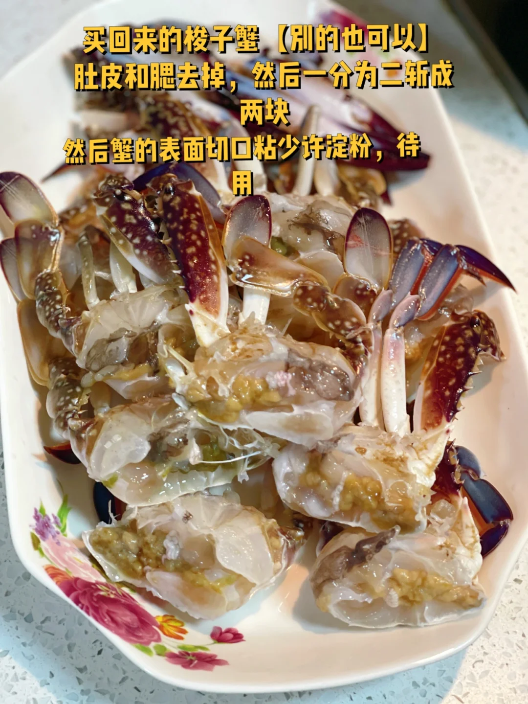 1. 买回来的梭子蟹【别的也可以】肚皮和腮去掉,然后一分为二斩成两块
