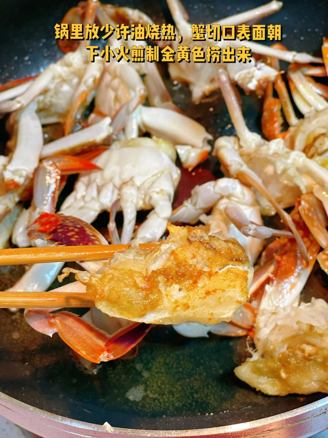 3. 锅里放少许油烧热,蟹切口表面朝下小火煎制金黄色捞出来