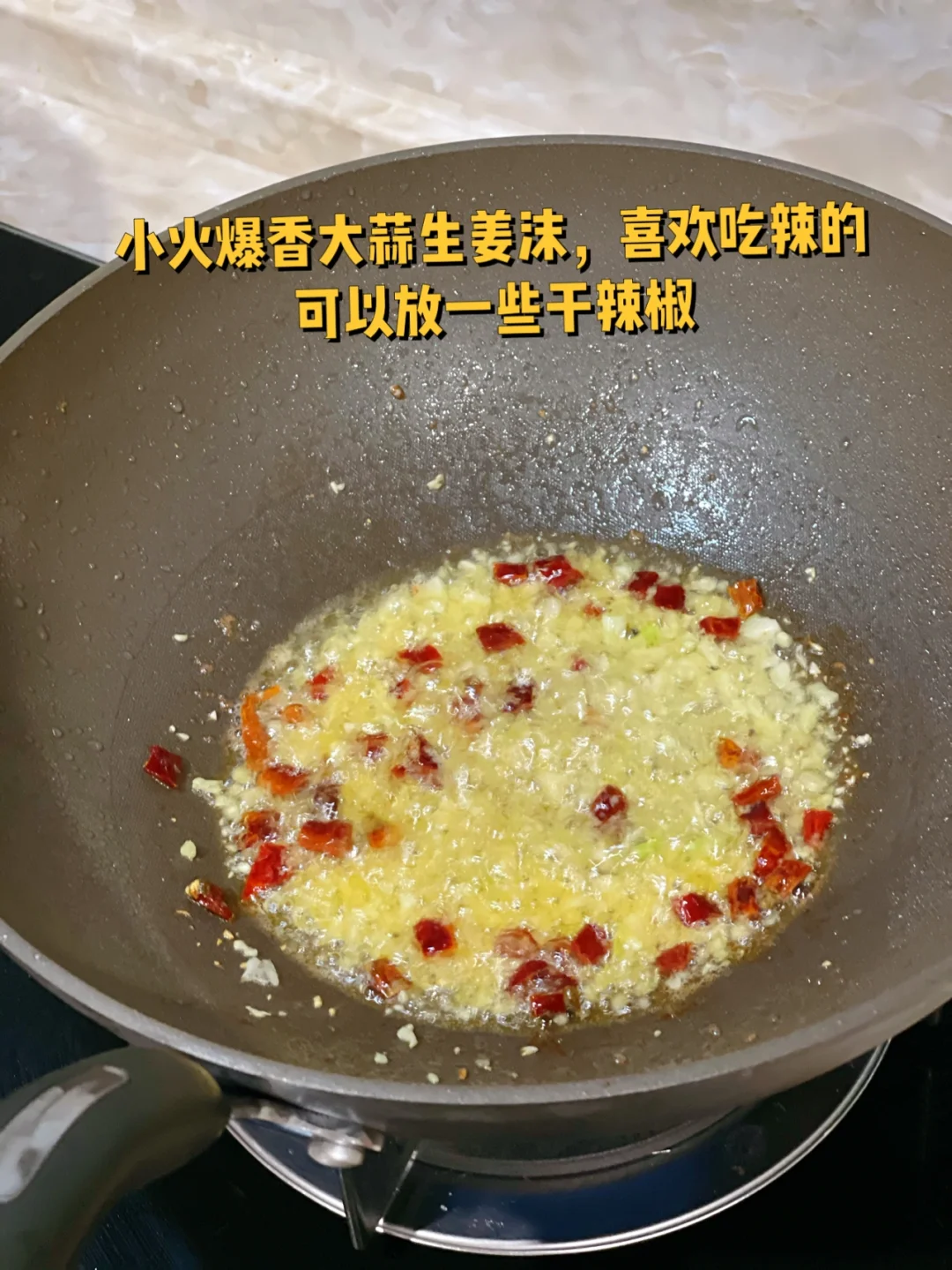 4. 小火爆香大蒜生姜沫,喜欢吃辣的可以放一些干辣椒
