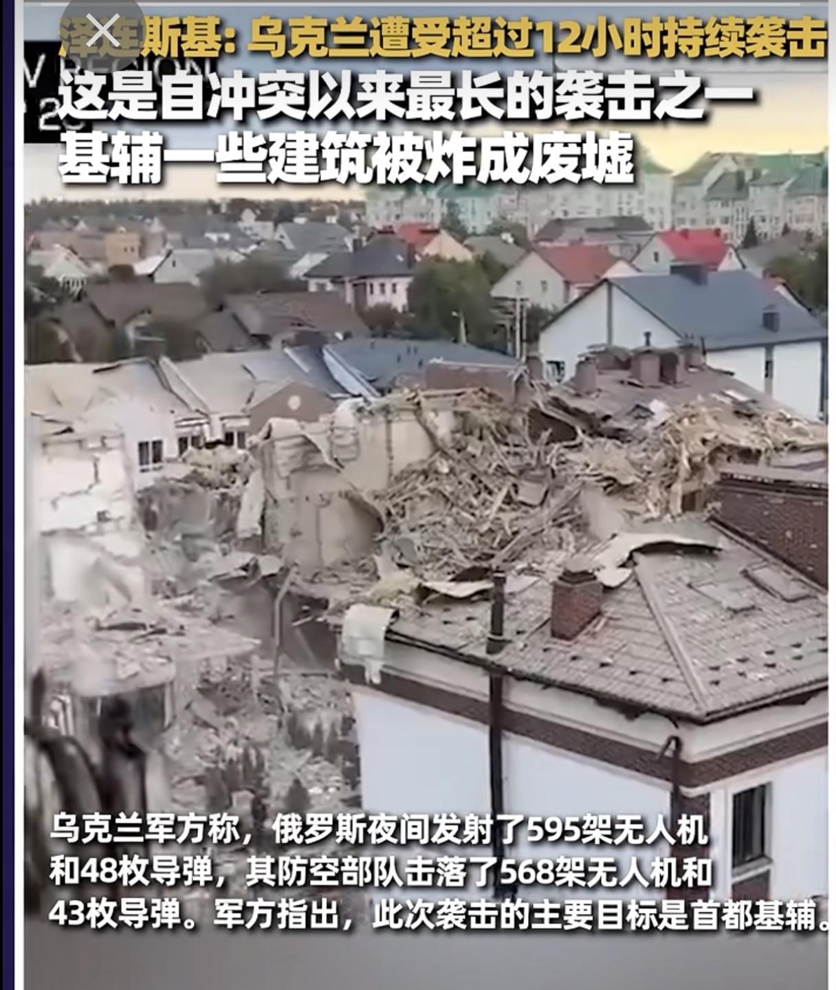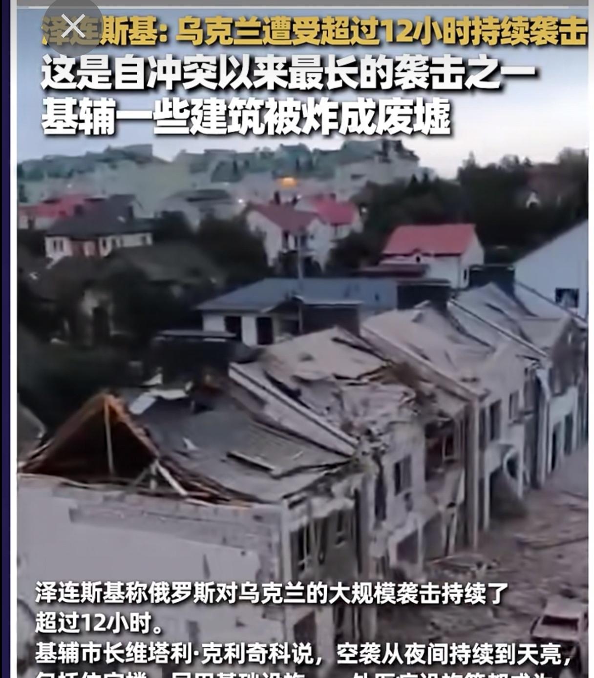 美国副总统万斯发声要给乌克兰提供“战斧”导弹袭击俄罗斯腹地及克里姆林宫后,俄罗斯发起了对乌克兰基辅的大规模了无人机和导弹袭击,袭击持续了12个小时,据称这是俄乌冲突以来俄军对乌最大规模的导弹和无人机袭击。基辅多处目标已成一片废墟。