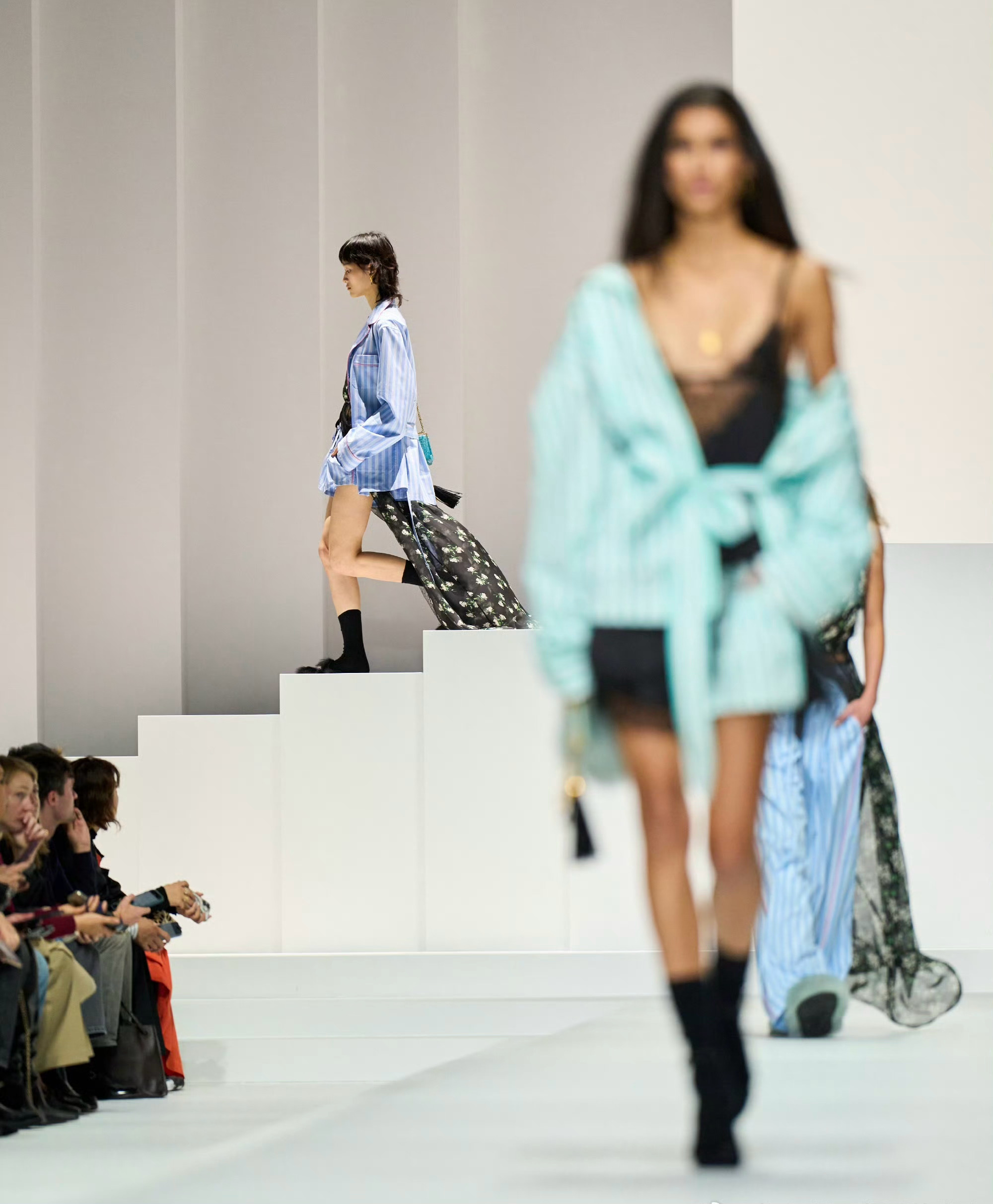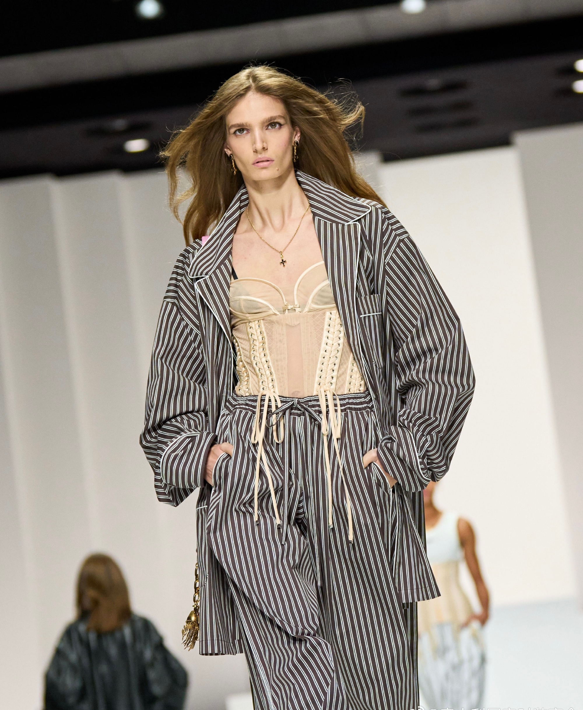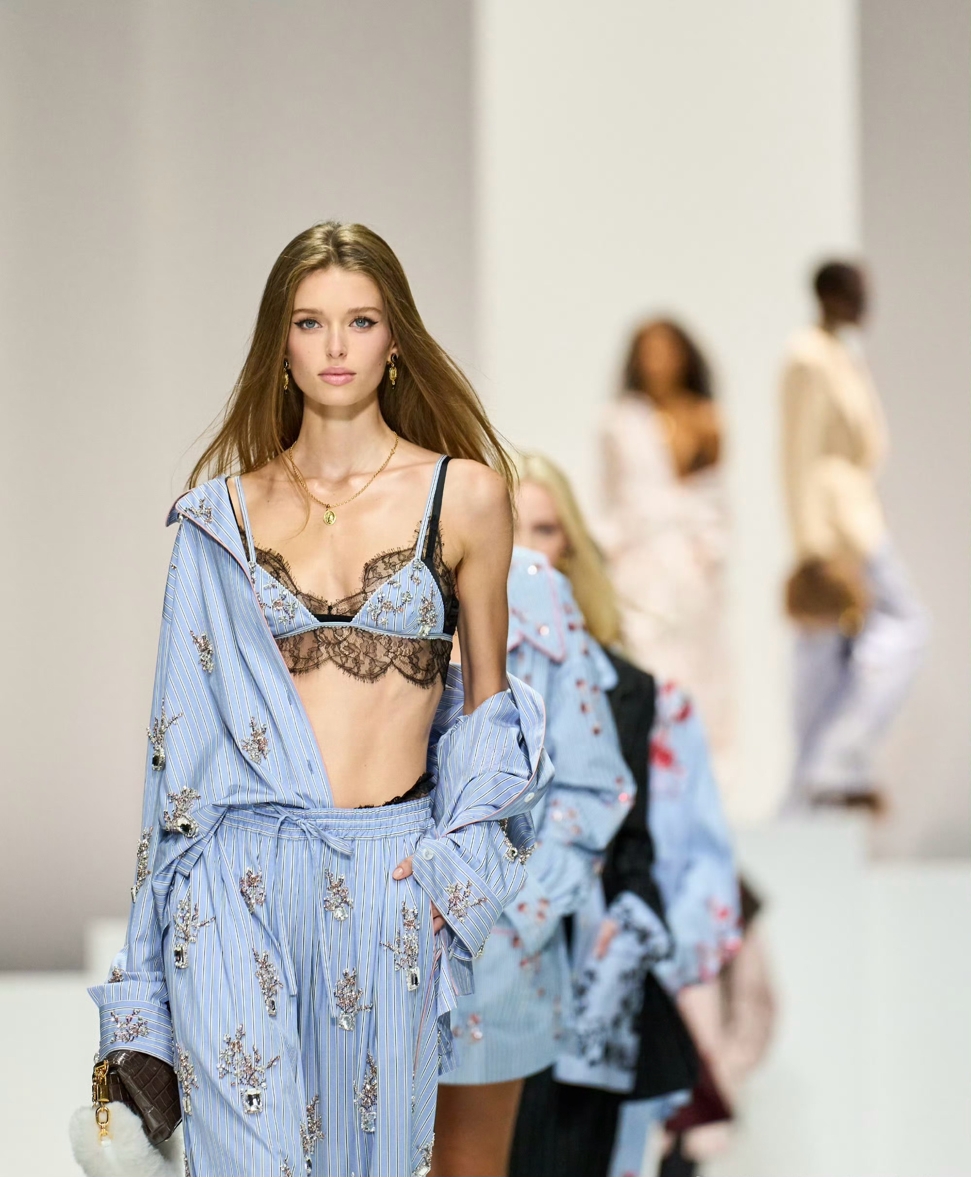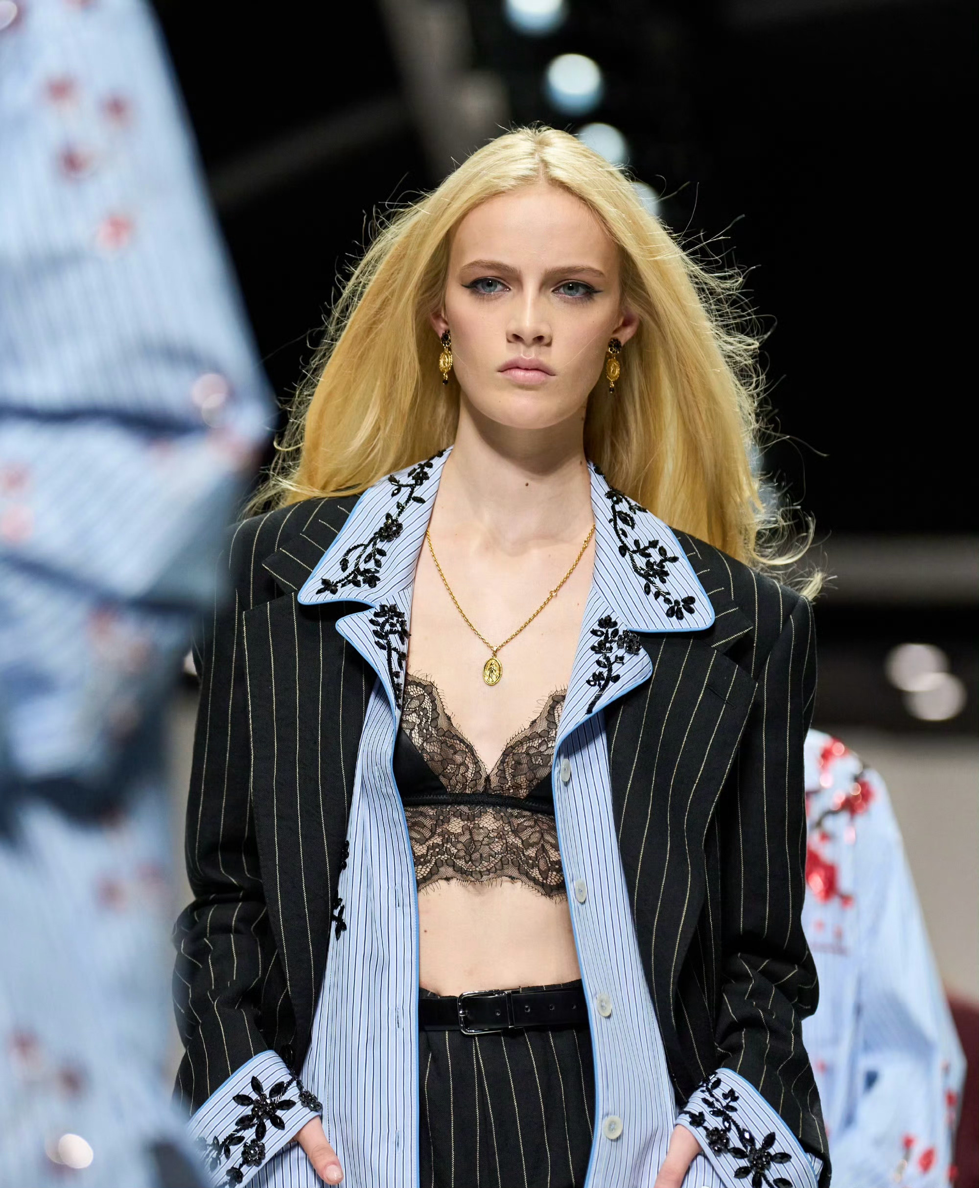 90 年代束身衣、蕾丝胸衣及飘逸连衣裙塑造柔美感;日间造型融合棉质、刺绣、亮片与宝石,晚装以黑色真丝雪纺与透视薄纱为主。