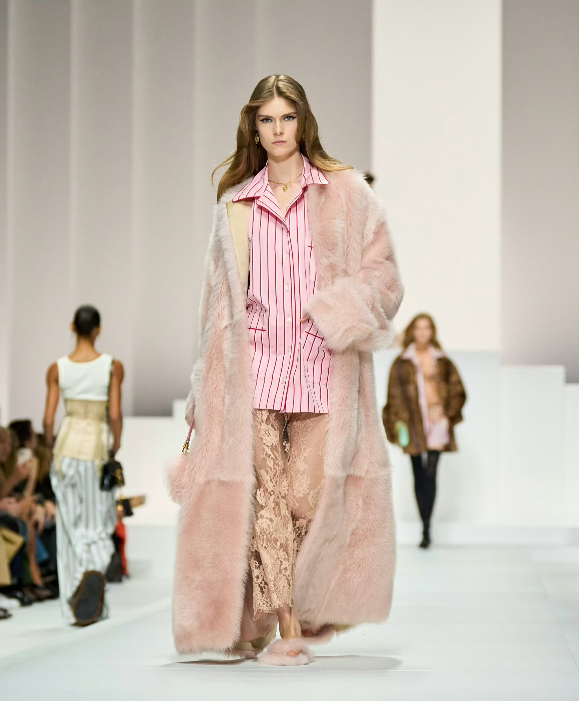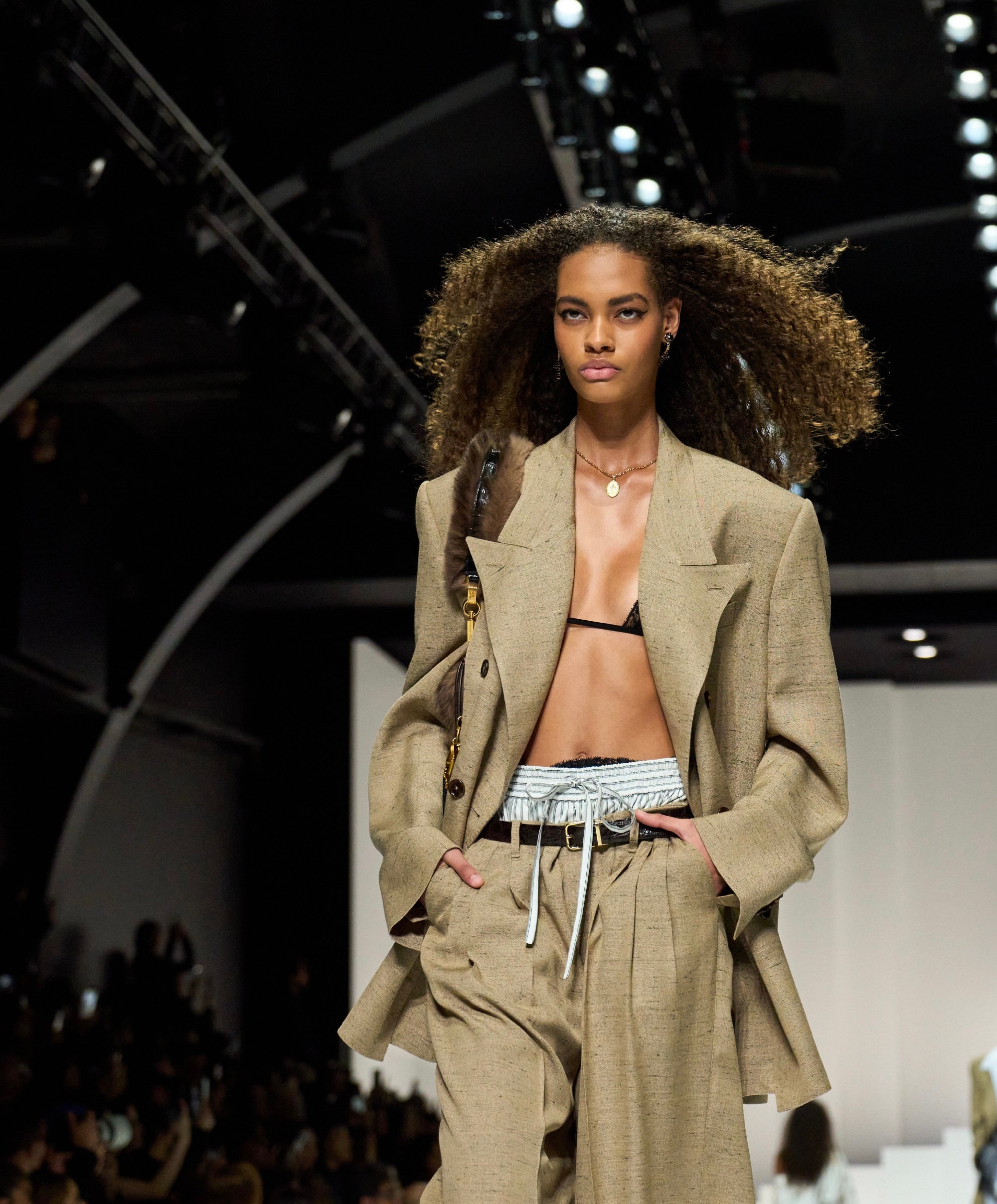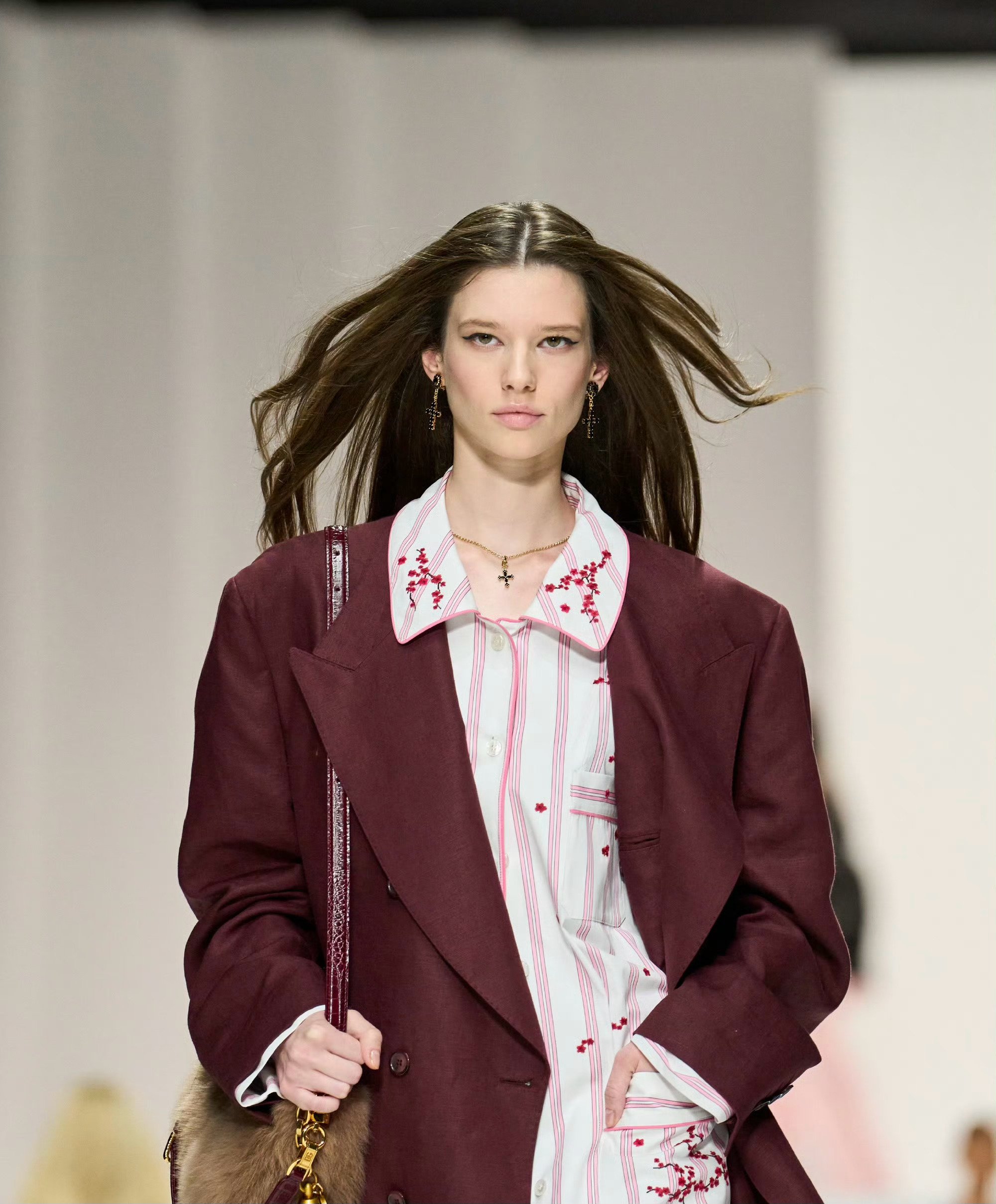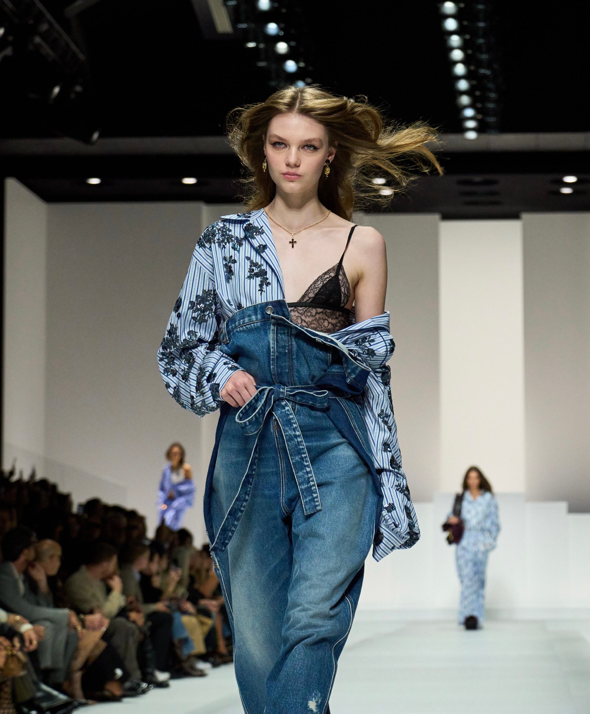 90 年代束身衣、蕾丝胸衣及飘逸连衣裙塑造柔美感;日间造型融合棉质、刺绣、亮片与宝石,晚装以黑色真丝雪纺与透视薄纱为主。