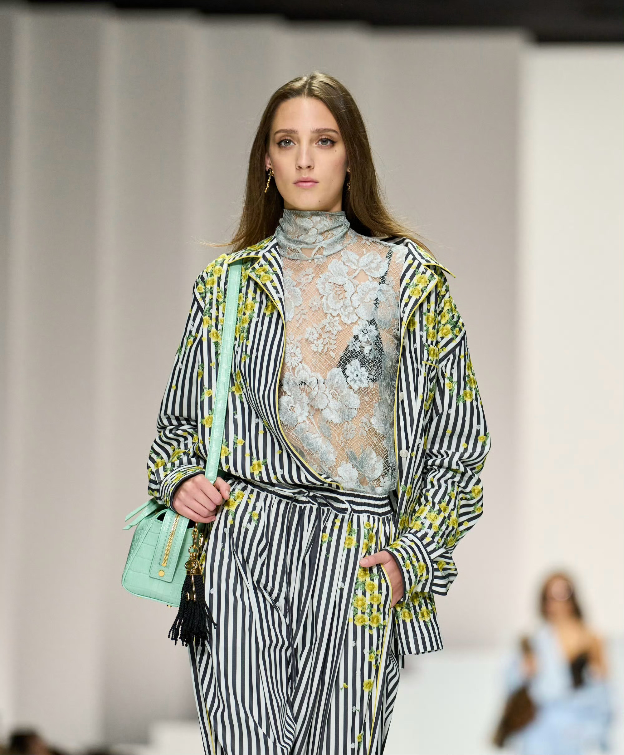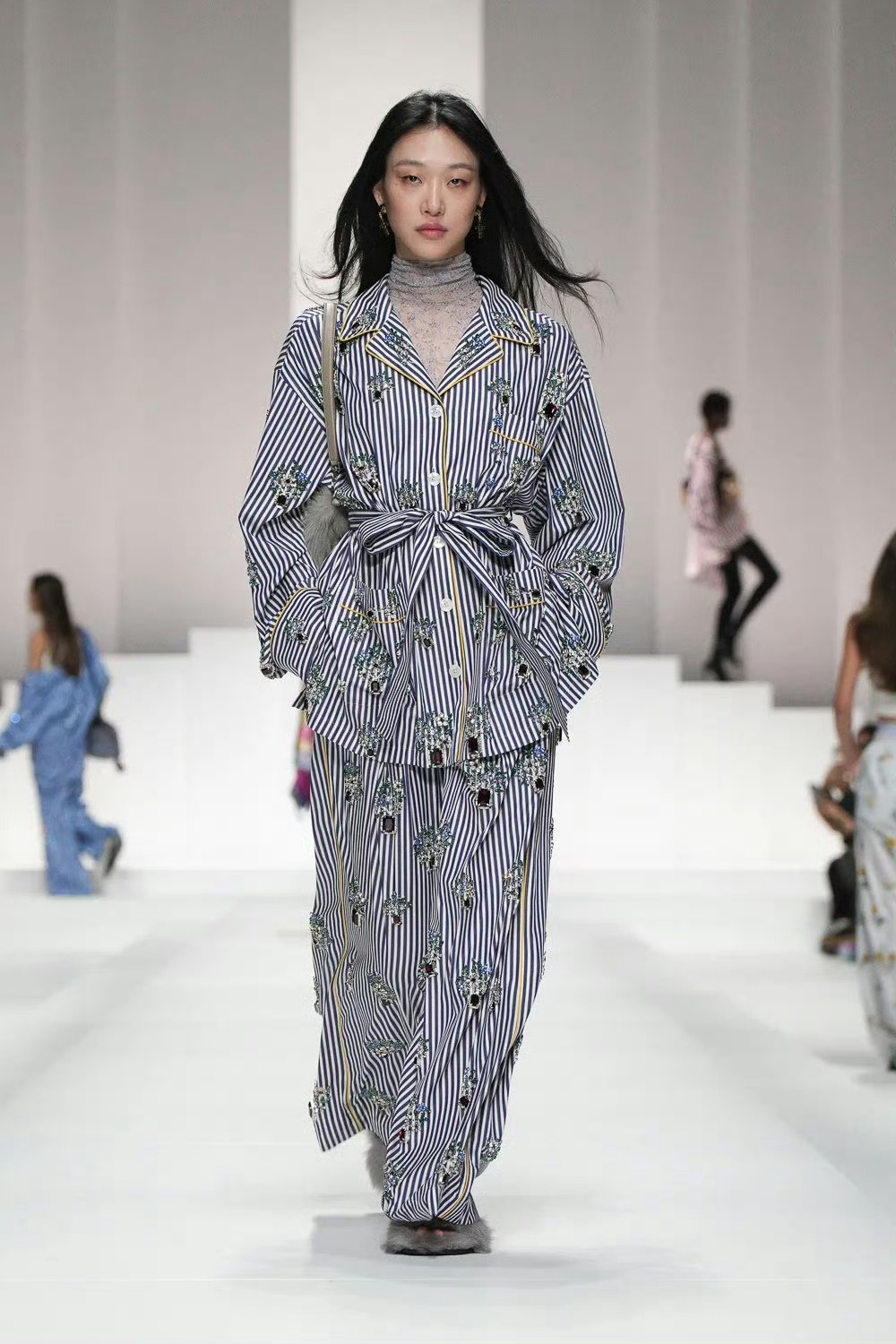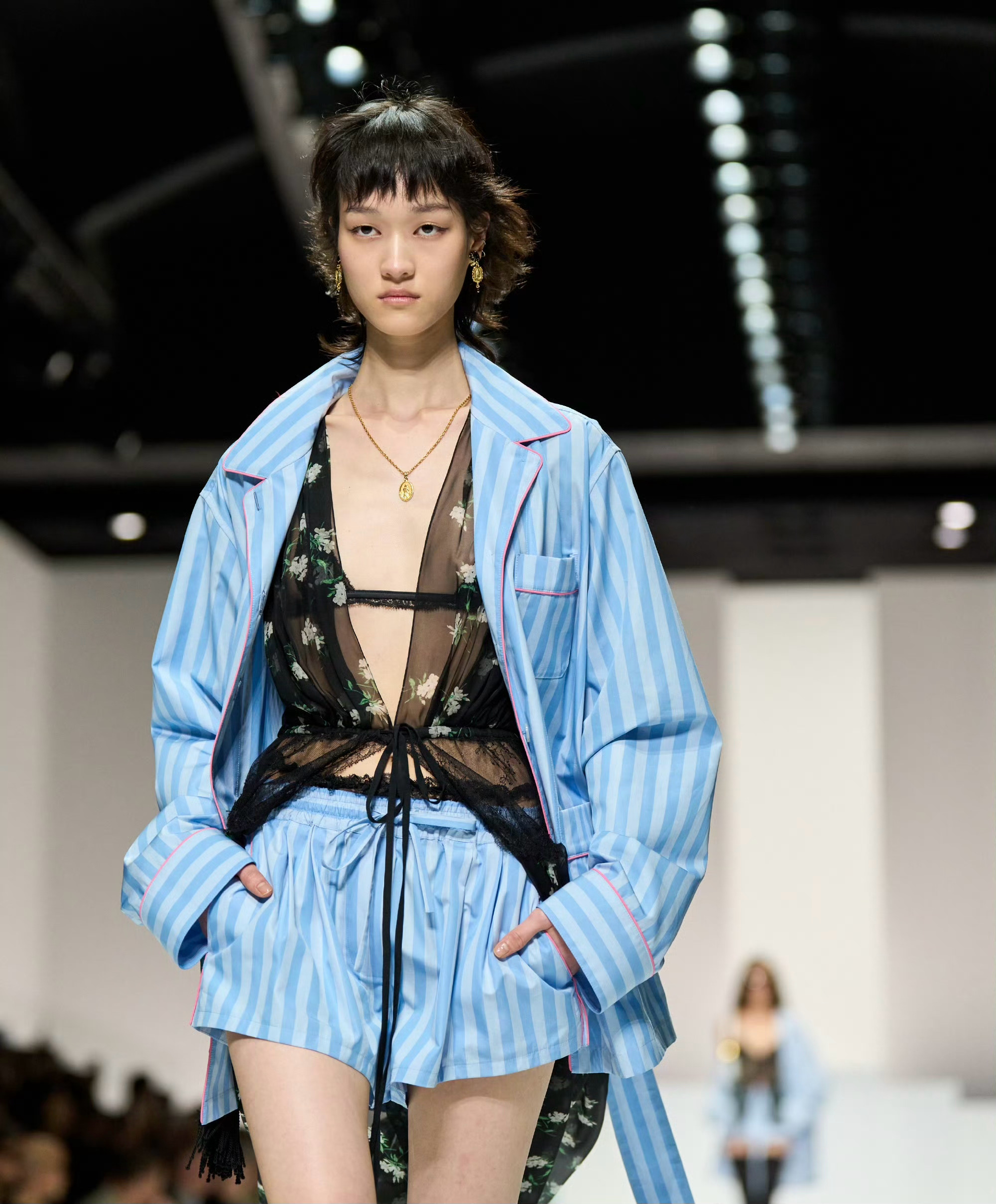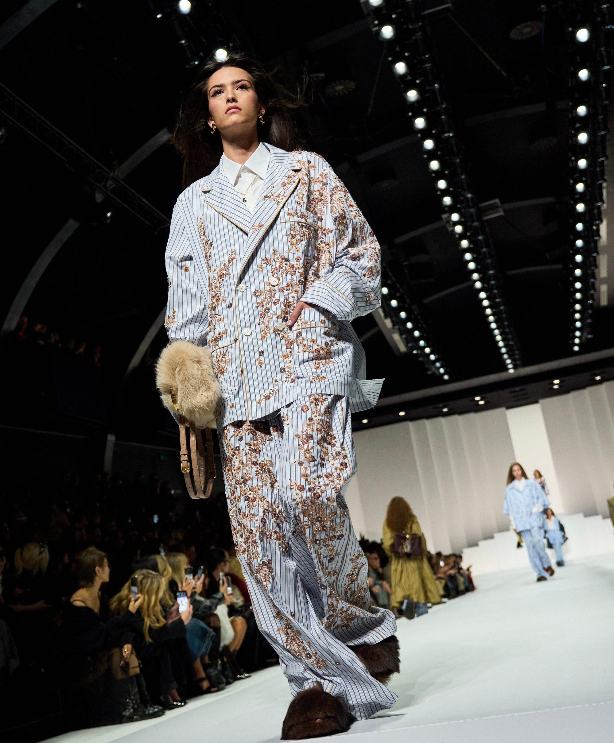 天蓝色睡衣借男装设计灵感,搭配花卉刺绣锦缎;