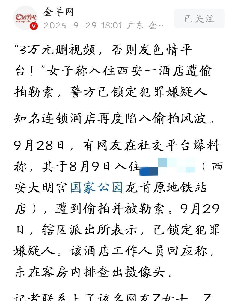 细思极恐!陕西西安,女子和同伴入住某连锁酒店,享受了一个美好的夜晚,谁知一个多月后,她竟然收到一条勒索信息,里面有她和直系亲属的准确信息和当晚的视频画面,要她马上打3万块钱,不然就把视频传到不良网站上。女子瞬间震惊,对方哪里来的这些信息,她怀疑是酒店泄露,于是果断报警。谁知,酒店的回应让人气愤。 8月9日,张女士和同伴一起入住了西安的一家连锁酒店。 虽然价格不便宜,但她心想,连锁酒店,总归更安全、私密性也更好,多花点钱买个放心。 入住过程很顺利,两个人在房间里度过了一个美好的夜晚,没察觉到任何不对劲。 可谁能想到,时隔一个多月后的9月27日,张女士突然收到了一条让她瞬间头皮发麻的信息。 对方不仅准确叫出了她的名字,还发来了她和同伴在酒店房间里的视频画面。 张女士整个人都懵了,脑子一片空白,这不是电视剧里才有的情节吗,怎么会发生在自己身上? 更过分的是,对方还威胁她,必须马上转3万元,否则就把视频上传到各种不健康网站,让她火遍全网。 尽管心里又慌又怕,张女士还是强作镇定,没有立刻转账,决定先看看情况再说。 但事情远没有结束,第二天,更吓人的事情发生了,对方又一次发来信息,这一次,里面竟然包括了她父母等直系亲属的联系方式。 这下张女士彻底慌了,要是被家里人看到这些,自己丢尽脸面不说,爸妈该多着急上火,一家人肯定不得安宁。 更让她想不通的是,自己的联系方式,身份信息还有家属的信息,对方是如何得知的?到底是酒店泄露,还是哪个环节出了问题? 这种被人从暗处盯着的感觉,让她后背发凉。 越想越怕,张女士不敢再犹豫,果断报了警。 对此,酒店方面回应称,已经全面排查了客房,但没有发现摄像头,他们也报了警。 这种不负责任的说法也张女士完全无法接受,没有摄像头,哪里来的画面呢?难道是自己拍的陷害就点不成?谁会拿自己的清白开玩笑,太敷衍了。 她当初就是觉得连锁酒店更可靠才选择的,结果却遇上这种离谱的事,只能说明,酒店的管理肯定存在严重漏洞。 张女士的遭遇也引起了很多人的担忧。马上就是国庆假期了,大家出门旅游总得住酒店,万一遇到这种情况,那可真是太糟心了。 根据《民法典》第1032条规定:任何组织或者个人不得以刺探、侵扰、泄露、公开等方式侵害他人的隐私权。 偷拍者未经张女士同意,拍摄并传播其在酒店房间内的视频,侵犯了张女士的隐私权。 若偷拍者泄露、流传、公开偷拍内容,或添加不当标题、评论,降低张女士的社会评价,还可能构成对其名誉权的侵害。 张女士有权请求偷拍者承担停止侵害、消除影响、恢复名誉、赔礼道歉等民事责任,还可以主张精神损害赔偿。 而且,偷拍者以非法占有为目的,以将视频上传到不健康网站相威胁,向张女士勒索3万元,可能构成敲诈勒索罪。 此外,酒店也应承担相应的民事赔偿责任。 张女士入住酒店被偷拍,而且个人信息被泄露,很明显,酒店未能尽到合理的安全保障义务,未对客房进行全面检查,未能及时发现并排除房间内可能存在的偷拍摄像头,导致张女士的隐私受到侵犯。 所以,酒店应承担相应的民事赔偿责任。 目前,警方已经立案,并锁定了嫌疑人,正在全力抓捕。