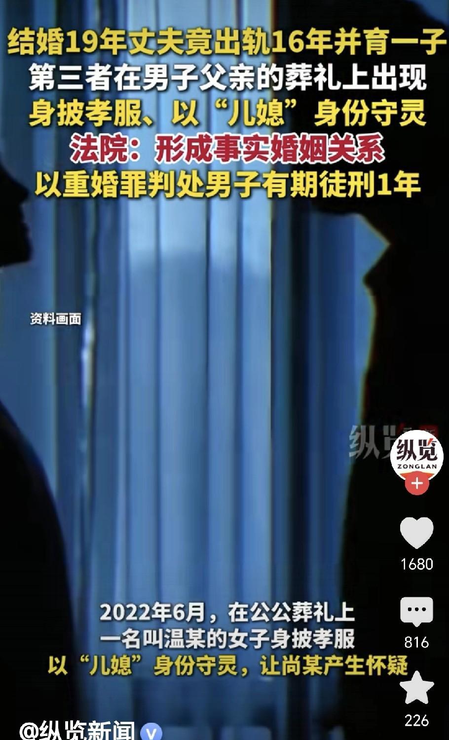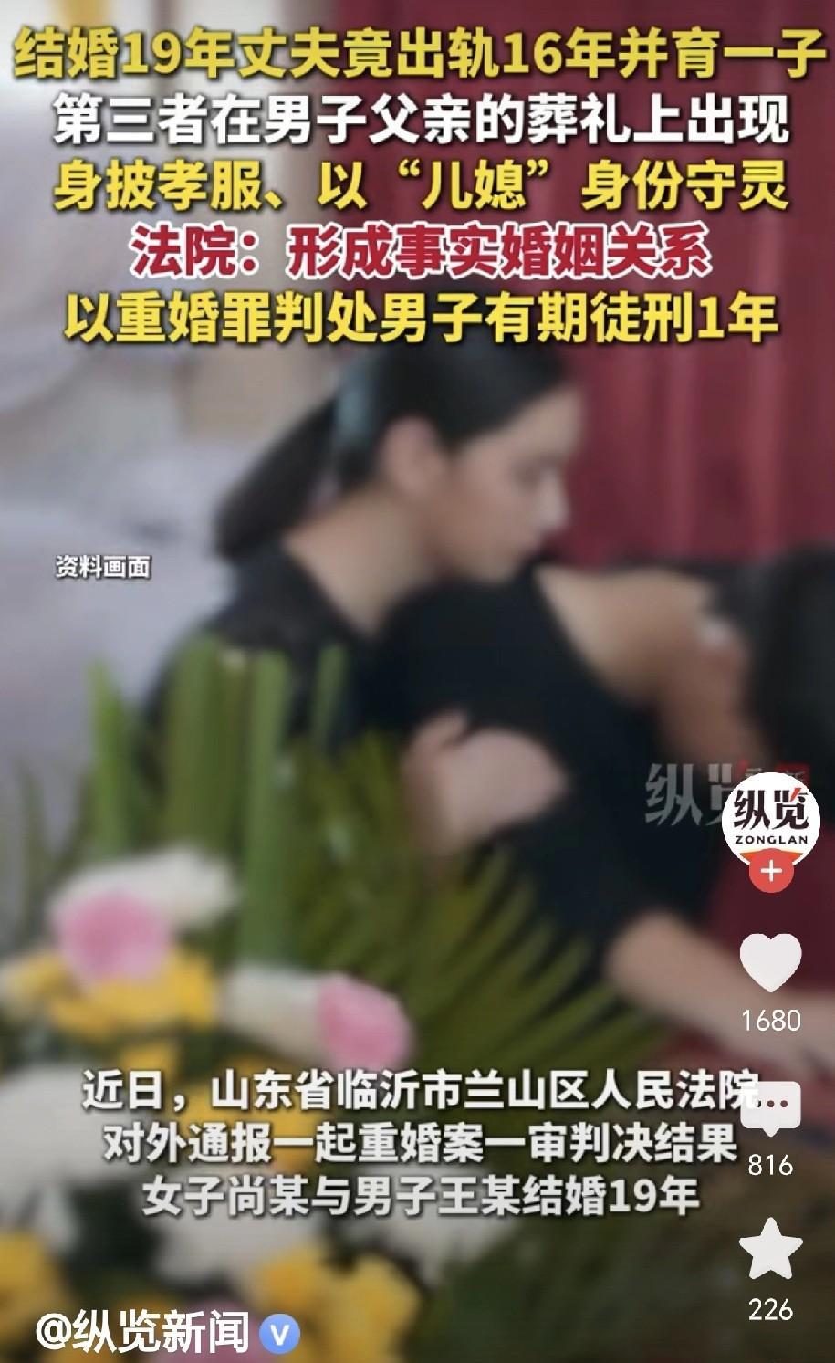 山东临沂,一女子公公去世,她给公公办理后事,突然发现一陌生女子,以儿媳身份披麻戴孝,为公公守灵,女子这才知道,她和丈夫结婚19年,丈夫出 轨16年,守灵的女子是2+1,听说公公去世,明目张胆以儿媳身份守灵,女子恍然大悟,怪不得从2016年开始,丈夫说自己跑长途货运,经常离家,原来他是去和2+1同住,俩人生了一子,对外宣称是夫妻,如今公公去世,她大摇大摆以儿媳身份守灵,女子告到法院,法院判了! 尚某和王某结婚19年,生活平淡,谈不上幸不幸福,可尚某认为,每一家都是如此,平平常常才是真实生活,不可能总像新婚时那样充满着热情。 丈夫在外工作,尚某守在家里,家里上有老人,下有孩子,她也想出去打工,可是始终离不开人。 2016年的时候,丈夫王某告诉妻子,说他以后要跑长途货运,工作辛苦,需要长期离家在外。 尚某信以为真,以为丈夫都是为了这个家庭,她没有阻止,一再叮咛丈夫在外,要小心平安。 她告诉丈夫,自己在家照顾,孩子老人他都不要担心,尤其是公公婆婆,他们年事已高,自己一定会替他尽孝,要他工作全力以赴。 从此后俩人见少离多,偶尔见面,王某态度冷淡,尚某毫不介意,反正都是老夫老妻,丈夫在外劳累,回来本来就该好好休息。 转眼到了2022年6月,尚某的公公年老去世,虽然不是她亲生父亲,可多年的相处,尚某早就将公婆视为亲人。 她悲从心起,哭的满脸是泪,可是她是老人的儿媳,担当起办理后事的重任。 她忙前忙后,招呼着亲戚朋友,分配着各种事情,她身穿孝衣,眼睛哭的像个核桃。 可突然之间,她发现一个陌生的女人,这女人十分奇怪,披麻戴孝跪在公公灵前。 尚某从来没有见过她,即便是最近的亲戚,也不至于这样戴孝,她既不是公公的女儿,更不是公公的儿媳。 尚某心里起疑,她赶忙向别人打听,这一问才知,这女子是丈夫的2+1,她得知王某父亲去世,公然以儿媳妇的身份来给王某父亲守灵。 这女子姓温,温某早在2006年就开始和王某同居,俩人后来还生了孩子,王某离开家时,就是跑去和她住在一起。 尚某这才知道,丈夫王某早就出车九了,当初借口说要跑长途货运,没时间回家,也没见他拿钱回来。 原来他说的跑长途货运,其实就是离家出走,搬出去和温某住在一起,他们以夫妻名义相称,同进同出,邻居们不知内情,一直以为他们就是合法的夫妻。 尚某这才恍然大悟,算起来丈夫出车九已经16年之久,自己被瞒的稀里糊涂,还在王某家里替他照顾一大家人。 自己辛辛苦苦,熬了19年之久,从青春年少,如今成了中年主妇,曾经的付出被王某视若无睹,尚某心酸,这事绝不能善罢甘休! 这段19年的婚姻,王某和温某在一起就高达16年的时间,原配王某成了个笑话,还心甘情愿站在他的背后,默默支持他的工作,成了他王家免费的保姆! 但凡王某有点良心,你不想过,你可以离婚,你放过原配,她也会有自己的生活,可是他啥也不说,只顾自己享受齐人之乐! 他道德败坏,既不忠于婚姻,对任何一方都不肯负责,他乐得自己自在,全然不顾原配的死活。 尚某忍无可忍,一纸诉状告到了法院,要求法院判王某重婚罪。 王某满口谎言,在法院替自己辩护,他说自己和温某只是搭帮过日子,并没有领取结婚证,因此,他不认为自己是重婚。 法院经过走访调查,王某和温某住处的邻居都做了证明,说他们平时就像夫妻一样生活。 一旦有人问起,他们也说彼此是夫妻,王某在物流园拉货,物流园有监控显示,他们同出同住,时时都在一起。 温某住院,王某以丈夫的身份为她签字,他一直都在温某身边陪伴,人证物证齐全,容不得王某信口狡辩。 那么,这件事在法律上是怎么认定的呢? 《刑法》第258条规定:有配偶而重婚的,或者明知他人有配偶而与之结婚的,处二年以下有期徒刑或者拘役。 王某在与尚某的婚姻关系存续期间,又与温某以夫妻名义共同生活,其行为符合重婚罪的定义。 虽然1994年2月1日民证部《婚姻登记管理条例》公布实施后,我国不再承认事实婚姻。 但根据《最高院关于<婚姻登记管理条例>施行后发生的以夫妻名义非法同居的重婚案件是否以重婚罪定罪处罚的批复》规定: 有配偶的人与他人以夫妻名义同居生活的,或者明知他人有配偶而与之以夫妻名义同居生活的,仍应按重婚罪定罪处罚。 王某与温某自2006年起开始同居,对外以夫妻名义相称,邻居也证明他们平时像夫妻一样生活,形成了事实婚姻,构成重婚罪。 认定重婚罪需要充分的证据,包括证人证言、同居行为证据等。 在本案中,邻居的证言证明王某和温某日常如夫妻,物流园监控显示两人同出同住,温某住院时王某以丈夫身份签字等证据,形成了完整的证据链。 这些证据,足以证明王某与温某以夫妻名义共同生活的事实,从而认定王某构成重婚罪。 最终法院判决,王某犯重婚罪,判有期徒刑1年。 关注@王哥说法 多学法律少吃亏!