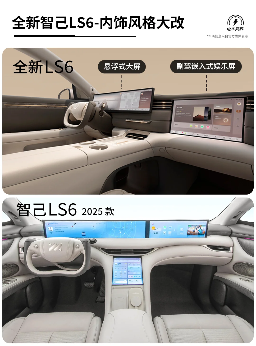内饰根据已曝光的信息来看,整体风格和老款变化大,原来的一体升降式大连屏幕改为了悬浮式大屏+大尺寸内嵌式副驾娱乐屏,新款智己LS6还采用了全幅式方向盘以及怀挡设计。