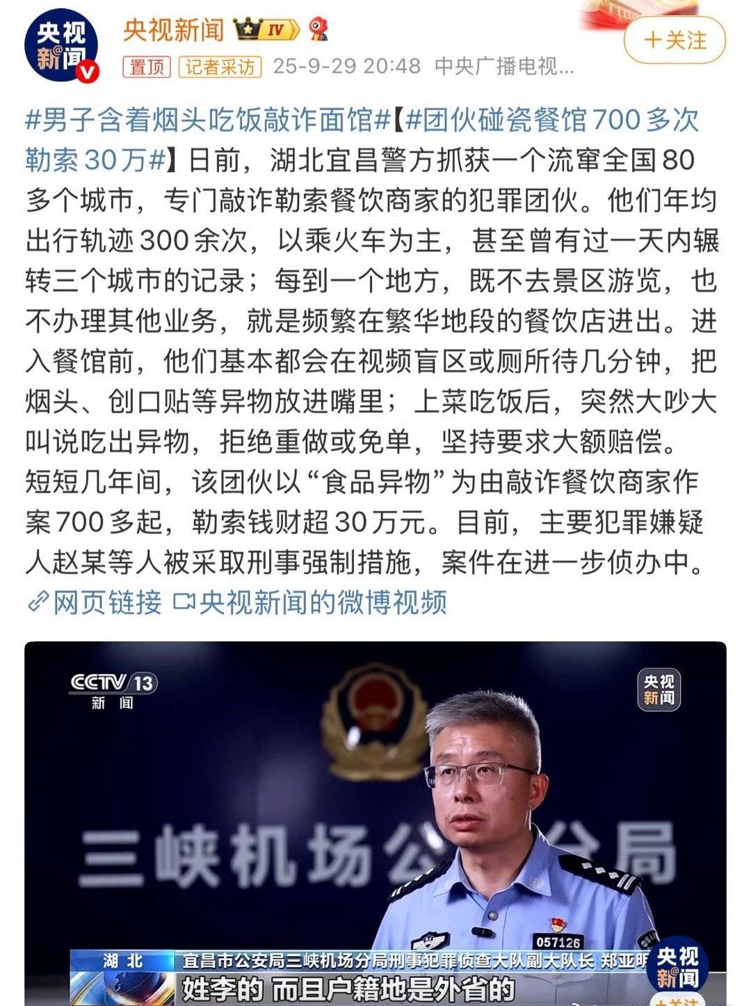 好家伙,这,事前藏匿或者口含烟头、创口贴、蟑螂? 日前,湖北宜昌警方破获一流窜全国80多个城市、专敲诈餐饮商家的犯罪团伙。 该团伙进店前在视频盲区或厕所藏烟头、创口贴等,上菜后佯装吃出异物吵闹,拒绝重做或免单,索要大额赔偿。 他们作案700余起,勒索超30万,主要嫌疑人已刑拘,案件在侦办。