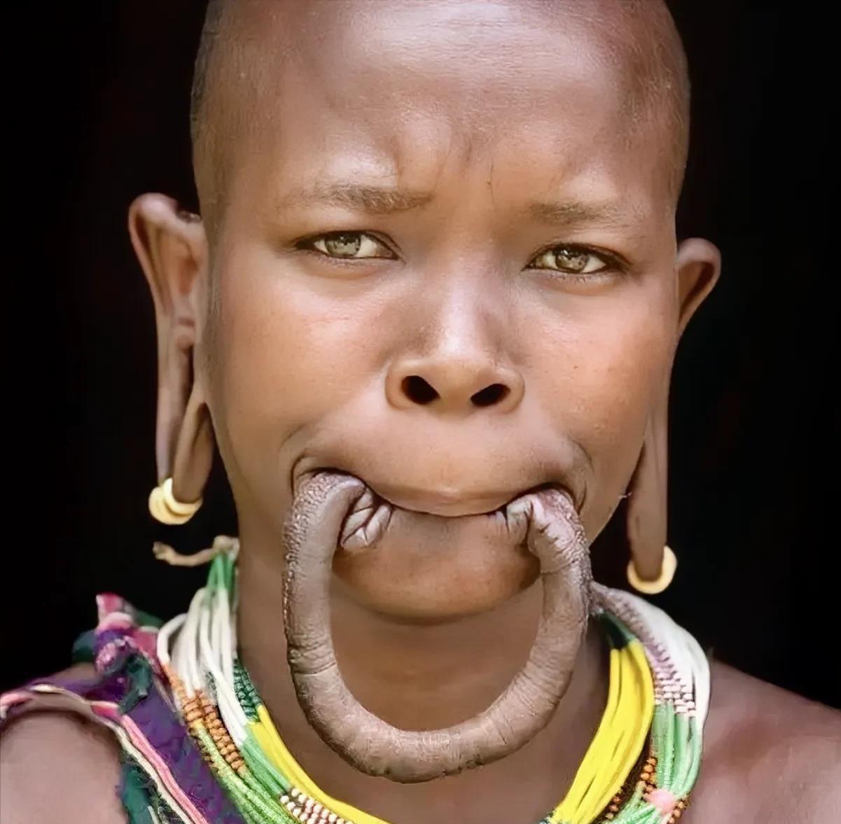 这是一名漂亮的非洲“唇盘族”女孩,她嘴里含着的并不是香肠,而是自己的下嘴唇。女孩剃着光头,脖子上挂着五彩斑斓的彩绳。她五官端正,看起来应该是个漂亮的女孩,可她那豁开的下嘴唇空荡荡的挂在脸上,看起来十分吓人。 信息来源:环球时报——埃塞“唇盘族”,下嘴唇越长越美丽 你见过把嘴唇撑到塞下拳头的人吗?在埃塞俄比亚南部的奥莫河谷,太阳把土地晒得裂成碎块,18岁的莫西族女孩尼娅蹲在茅草屋前搓高粱粒,脖子上红的蓝的彩绳晃来晃去——红色代表健康,蓝色是吉祥,都是她族里的讲究。 可最扎眼的,是她嘴里含着的20厘米陶土盘,下唇被撑得垂下来,像挂着块不规则的石头。 这不是什么奇怪的装饰,是尼娅所属的莫西族(俗称“唇盘族”)的传统,《环球日报》之前专门报道过。 你可能会问,好好的嘴唇为啥要折腾成这样?其实最早这是为了保命——以前河谷里常有侵略者抢女人当奴隶,莫西族人让女孩撑大嘴唇,在外人眼里“怪异”,反而能躲过劫难。 慢慢的,这成了“美的象征”,现在唇盘大小还跟彩礼挂钩,尼娅这盘子能换50头牛,够全家活好几年。 不过这盘子可不是随便戴的,从10岁就得遭罪。 族里巫医用燧石刀划开下唇,没麻药,就给根木棍咬着,还得敲掉两颗门牙防止嘴唇闭合,再塞进小陶片。 之后每半年换个大盘,一点点把嘴唇撑开。尼娅说,她当年做手术时,三个女孩感染,一个没撑过雨季——那边连干净的布都难找,感染了只能靠草木灰敷,能不能活全看运气。 看到这儿,你会不会想起咱们中国古代的缠足? 其实这两种习俗,虽然隔了几万里,却有着相似的无奈。 古代女孩大概四五岁,骨头还没长硬,就被大人用长布条紧紧裹住脚,把除了大脚趾以外的四个脚趾往脚心掰,硬生生折成“三寸金莲”。 裹的时候疼得直哭,夜里疼得睡不着,就算侥幸没烂脚,以后走路也得扶着墙,稍微走快点就疼得冒冷汗。 你可能会问,缠足又是为了啥?跟莫西族撑唇盘类似,也是为了符合当时的“审美”。 古代男人觉得“小脚好看”,还说“三寸金莲为美”,甚至把小脚当成女人“贤淑”的标志。 那时候要是女孩不缠足,不光没人提亲,还会被说“不端庄”。有些人家为了让女儿嫁个好人家,就算心疼,也得硬着心肠裹脚——就像莫西族女孩为了家族的牛,咬牙撑唇盘一样,都是被时代的规矩绑着。 不过现在不一样了,不管是莫西族的唇盘,还是中国古代的缠足,都在慢慢变。 尼娅的妹妹今年10岁,死活不肯做唇盘手术,说“要去城里上学,不想被人当怪物看”。 部落里的宣传车每个月来一次,喊着“唇盘致癌”,政府还设了诊疗所用抗生素代替草木灰,少了很多感染的风险。 咱们中国的缠足,清末民初就开始废除了,现在只能在博物馆里看到当年的小脚鞋,谁也不会再让女孩遭那份罪。 现在尼娅有时候会去保护区当导游,脖子上的彩绳换成了工作证,给游客讲唇盘的历史。 有次一个欧洲女孩听完,掀起衣服,腰上纹着个小小的唇盘图案。 尼娅摸了摸自己下唇的疤痕,没说话,只是看着远处的奥莫河——河水浑浊,却映着天上的彩虹,像把他们的传统和外面的世界,都裹进了这晃荡的光影里。 其实不管是唇盘还是缠足,都是特定时代的文化产物。 那时候的人觉得“这样是对的”,可现在我们知道,真正的美,不是折腾自己的身体,而是能自主选择怎么活。 每个文化都有自己的过去,重要的是跟着时代往前走,尊重每个人的身体,不再让“规矩”变成“折磨”。 你还知道哪些过去的老习俗?评论区聊聊,咱们一起看看时代是怎么慢慢变好的。
