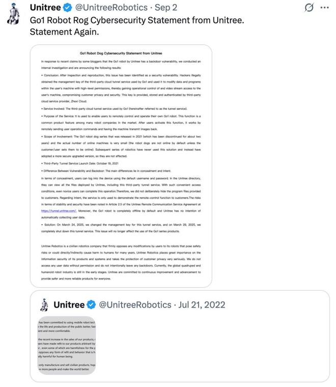 9月29日,宇树科技在社交平台X上发表声明,称已意识到部分用户在使用宇树机器人时发现了安全漏洞和网络相关问题,“我们立即开始处理这些问题,目前已完成大部分修复。这些更新将在不久的将来推送”。