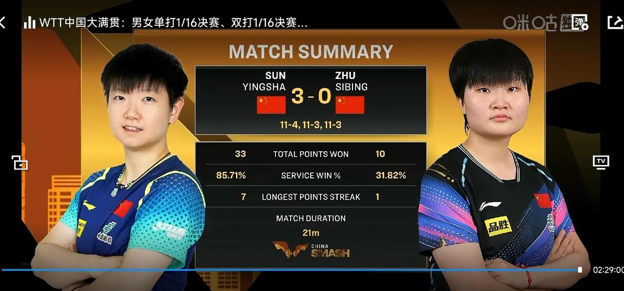 世界第一孙颖莎直落三局,以11:4;11:3;11:3的比分战胜削球手队友朱思冰