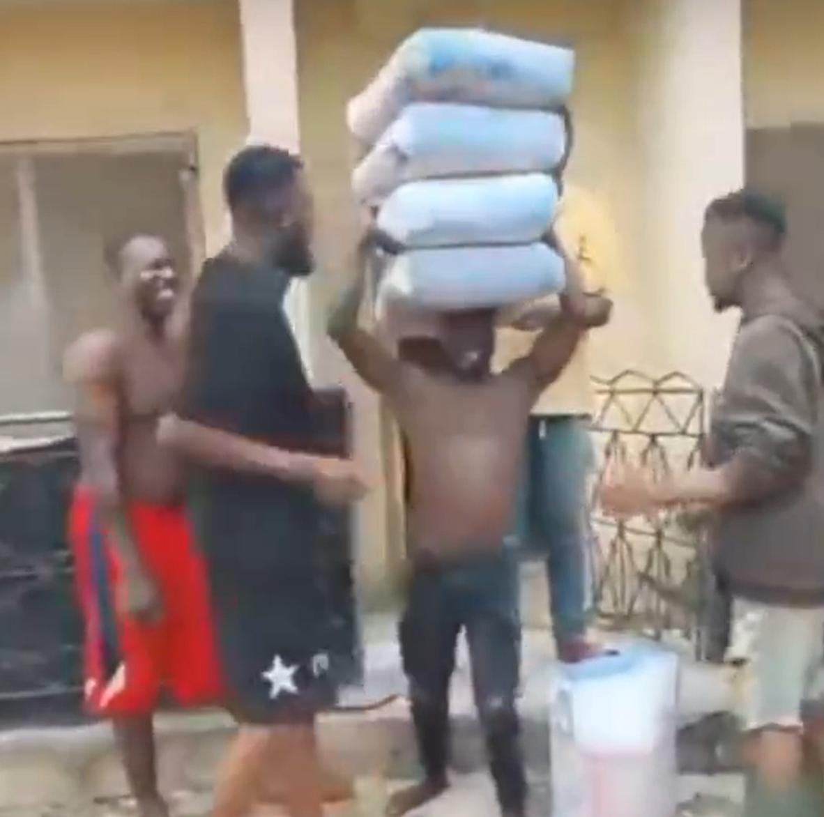 近日,尼日利亚的一名男子与朋友打赌,比一比两个人谁的脑袋顶的袋装水泥多,奖品是朋