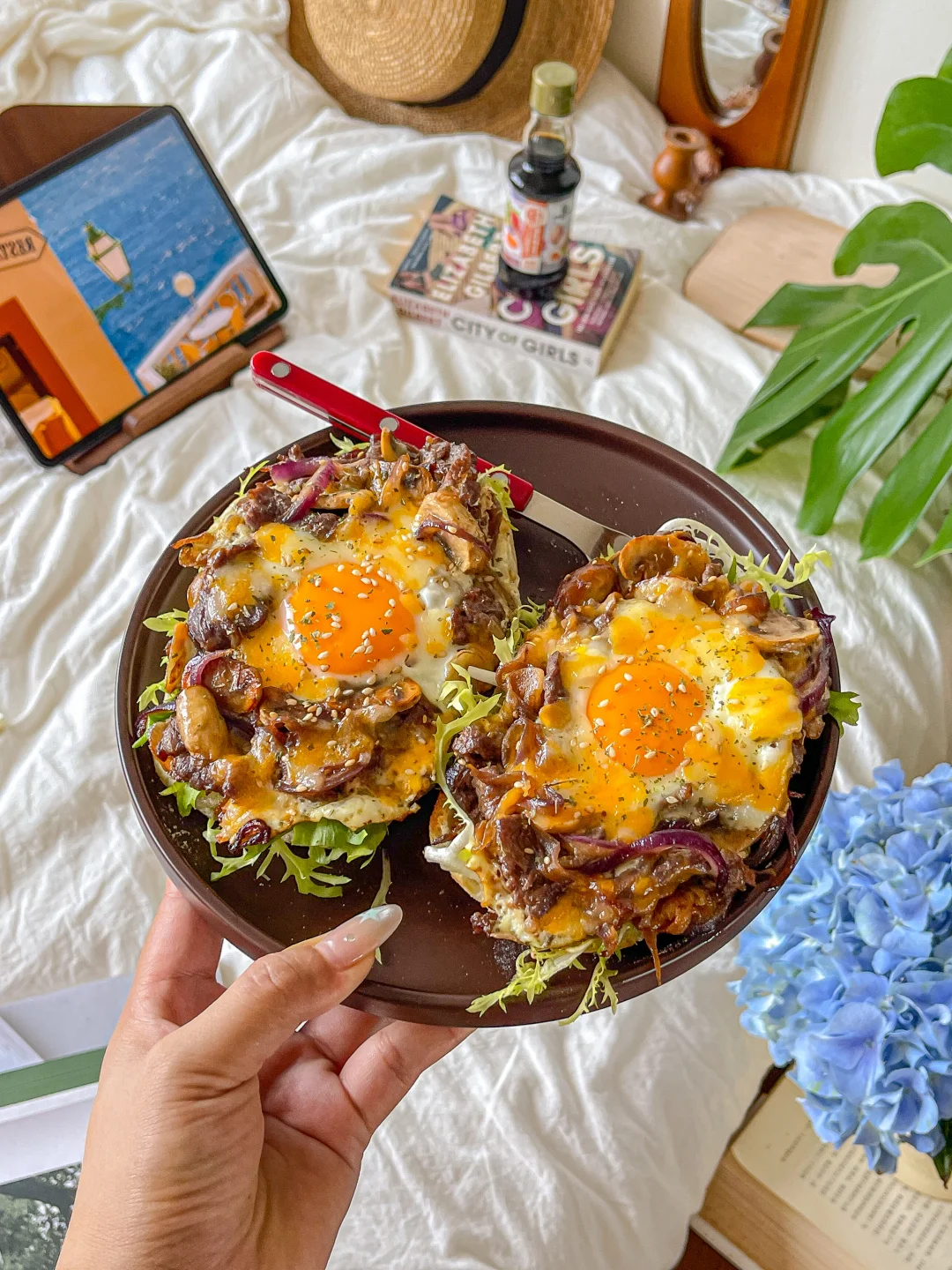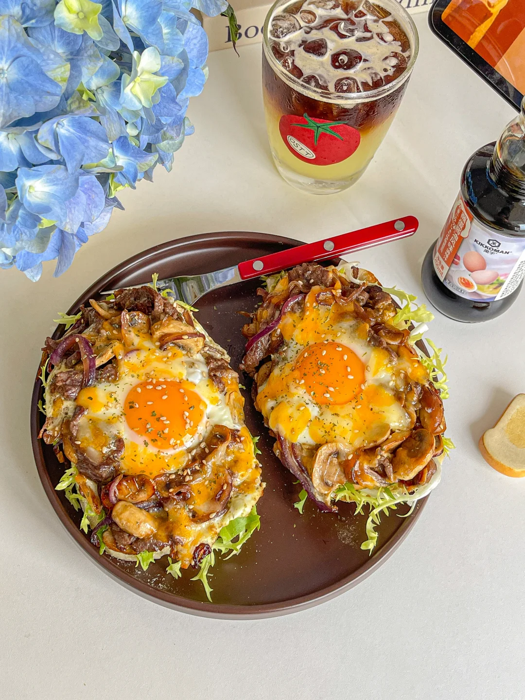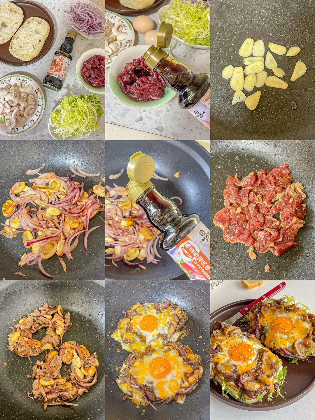 夏天来点简单的营养三明治🍳 不用再厨房呆太久 轻松搞定✌🏻 食材:🥖 恰巴塔➕苦苣➕洋葱➕大蒜➕牛肉➕芝士片➕无菌蛋 做法:🥣 1.牛肉用适量萬字蘸蛋风味酱油抓拌均匀 腌制15分钟左右 2.蒜炒香放入洋葱和口蘑 也加入蘸蛋风味酱油翻炒均匀 3.再把牛肉倒进去炒至7分熟 混合炒在一起 中间打入鸡蛋撕一些芝士片 盖上盖子焖至鸡蛋凝固即可 牛肉洋葱鸡蛋的三重搭配 低卡又高蛋白 一口咬下去 层次丰富 幸福感拉满!🥰 这份早午餐简直就是懒人快手早餐的神 巨方便 调味的部分直接加入蘸蛋风味酱油翻炒就好了 不需要其他额外的调料 干净又简单😊风味十足 !最近爱不释口的酱油 👍🏻 还用它解锁了各种水煮菜的神仙吃法✨水煮鸡蛋 青菜 或肉 加入灵魂蘸蛋酱油 一口下去鲜甜咸香 连蛋黄都变得chao鲜美 每一口都是实打实的享受 干净又健康 简直是管理期必备的酱油[偷笑R][赞R]