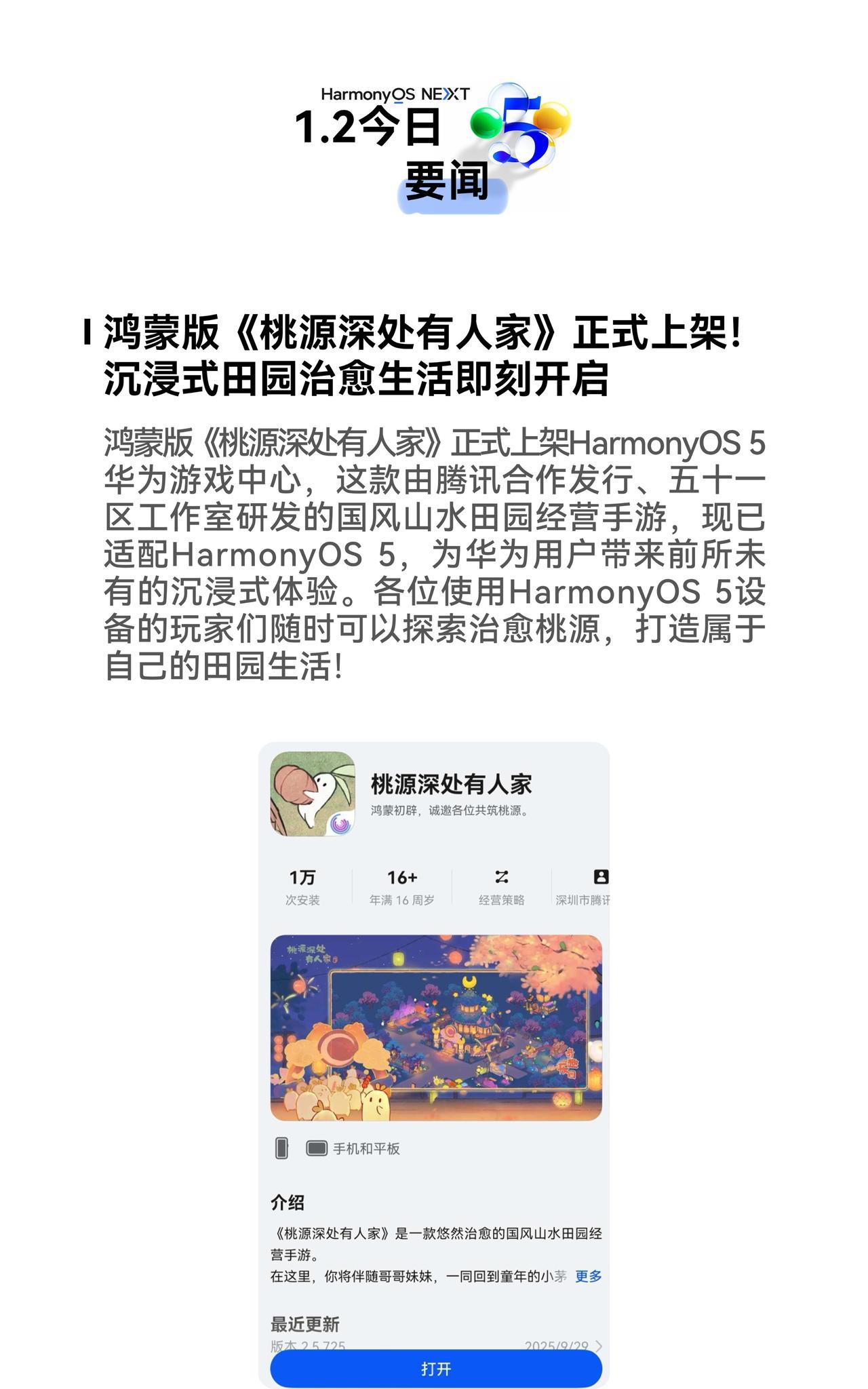 9月30日鸿蒙生态日日新PLOG:HarmonyOS 5终端设备数量突破2000万,超百家伙伴齐贺!华为携手近20家伙伴带来“鸿蒙有礼特别版”;鸿蒙版《桃源深处有人家》正式上架,沉浸式田园治愈生活即刻开启;QQ音乐、番茄免费小说等多款应用也迎来重要更新;鸿蒙操作系统 5,更安全、更流畅、更智能,欢迎在“我的华为”App>升级尝鲜报名体验。#鸿蒙5大有不同# #HarmonyOS5#