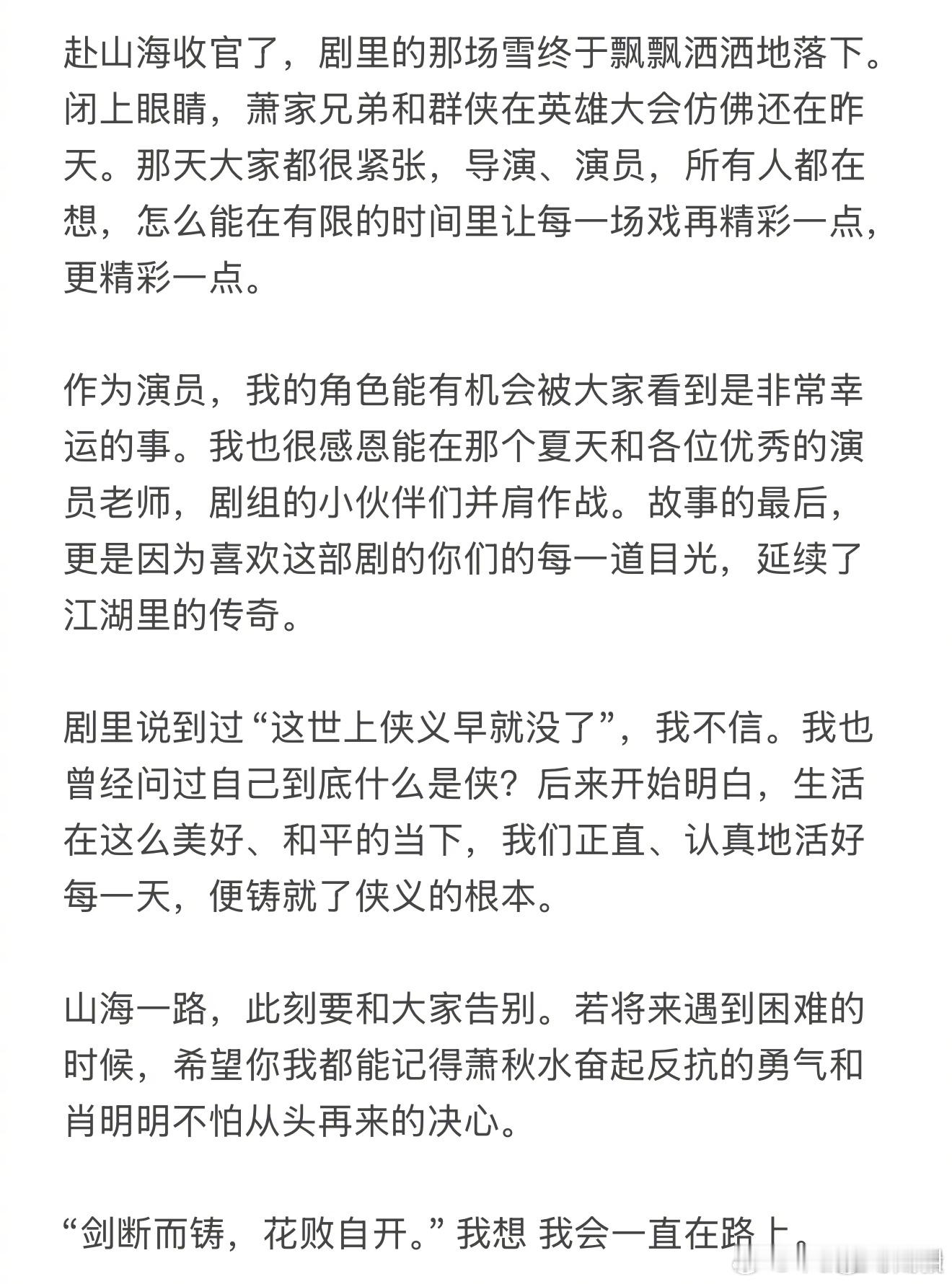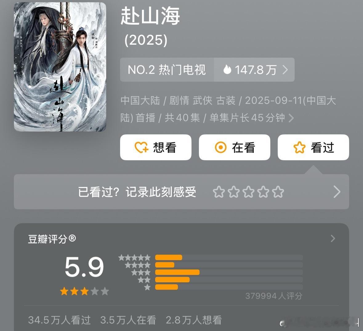 成毅发了赴山海收官文,《赴山海》也豆瓣开分了,5.9分