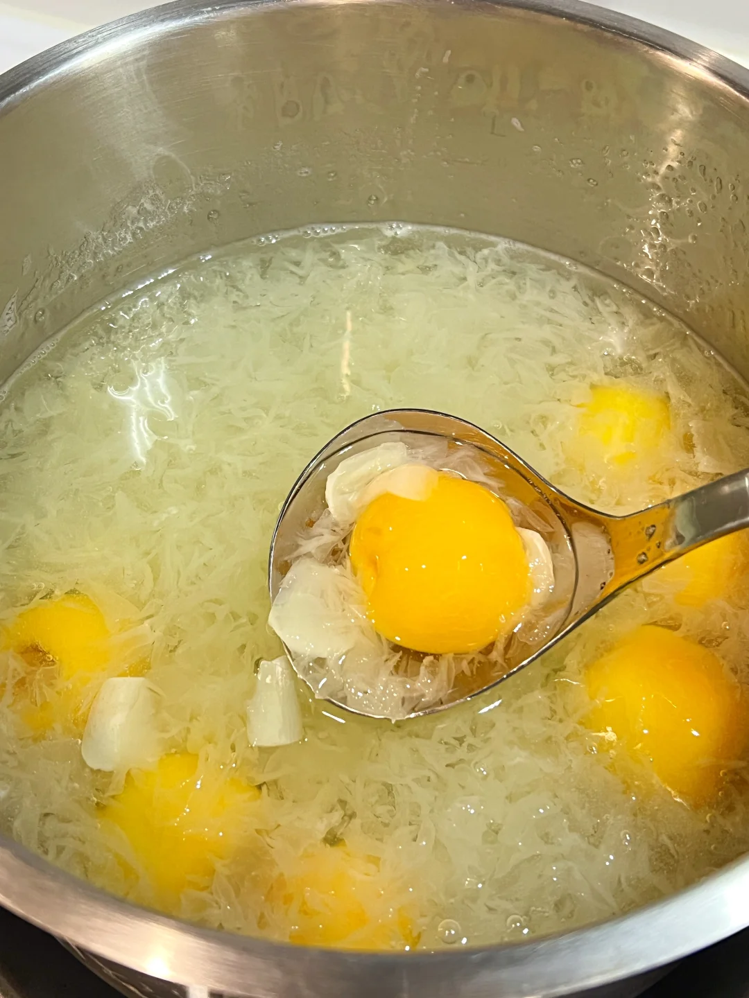 1️⃣银耳洗净切碎后放入锅中,加1000毫升清水,大火烧开后,小火煲30分钟。