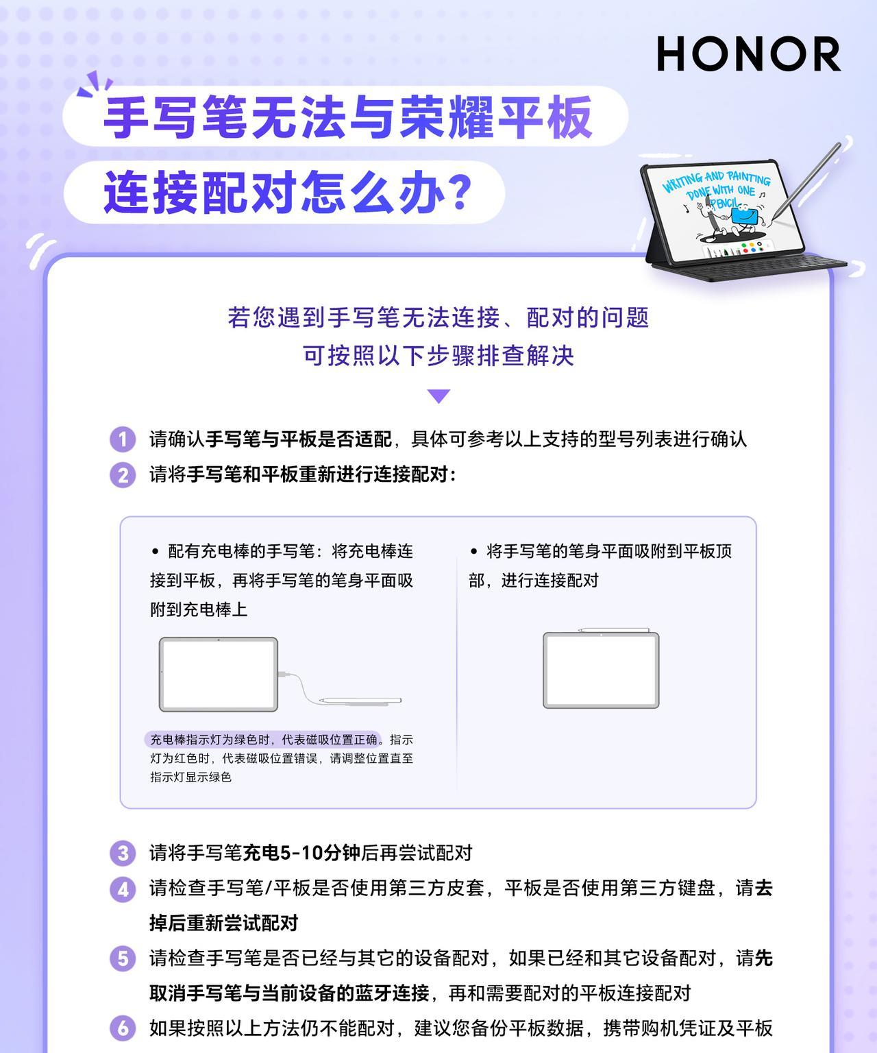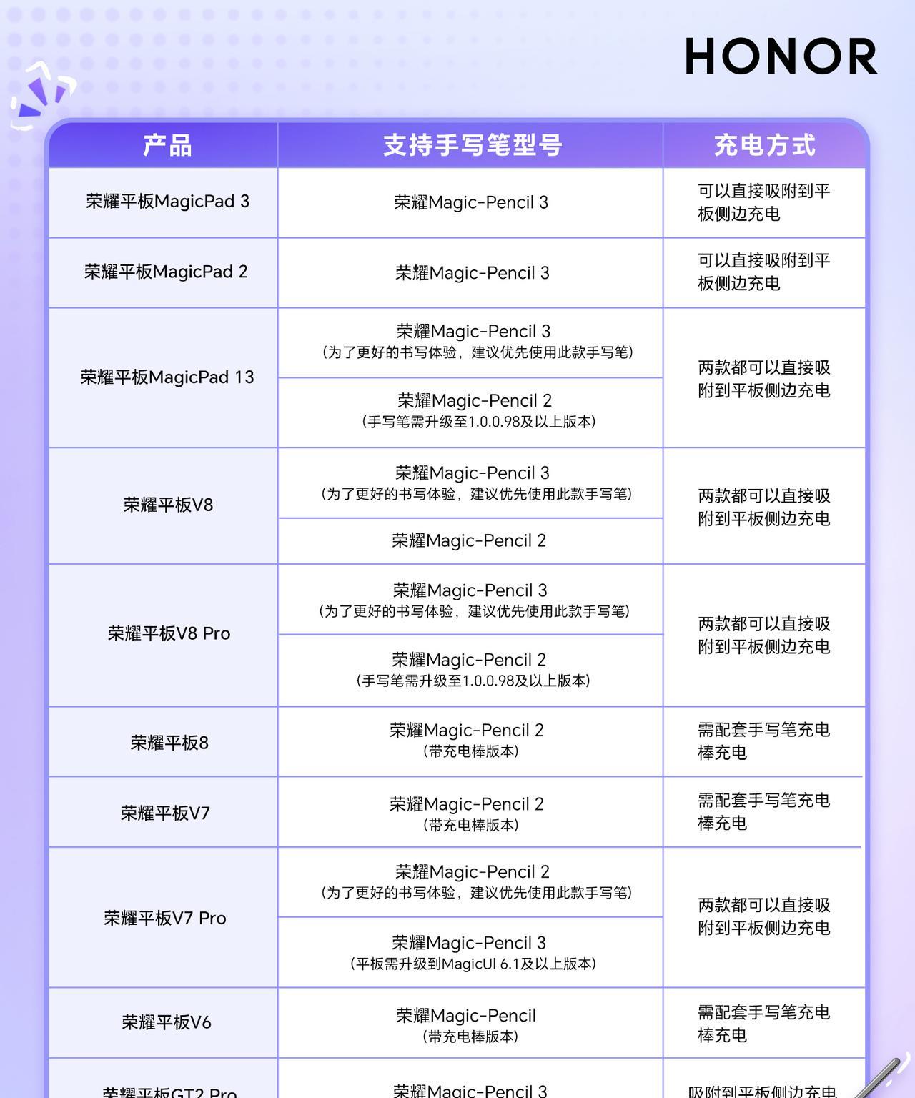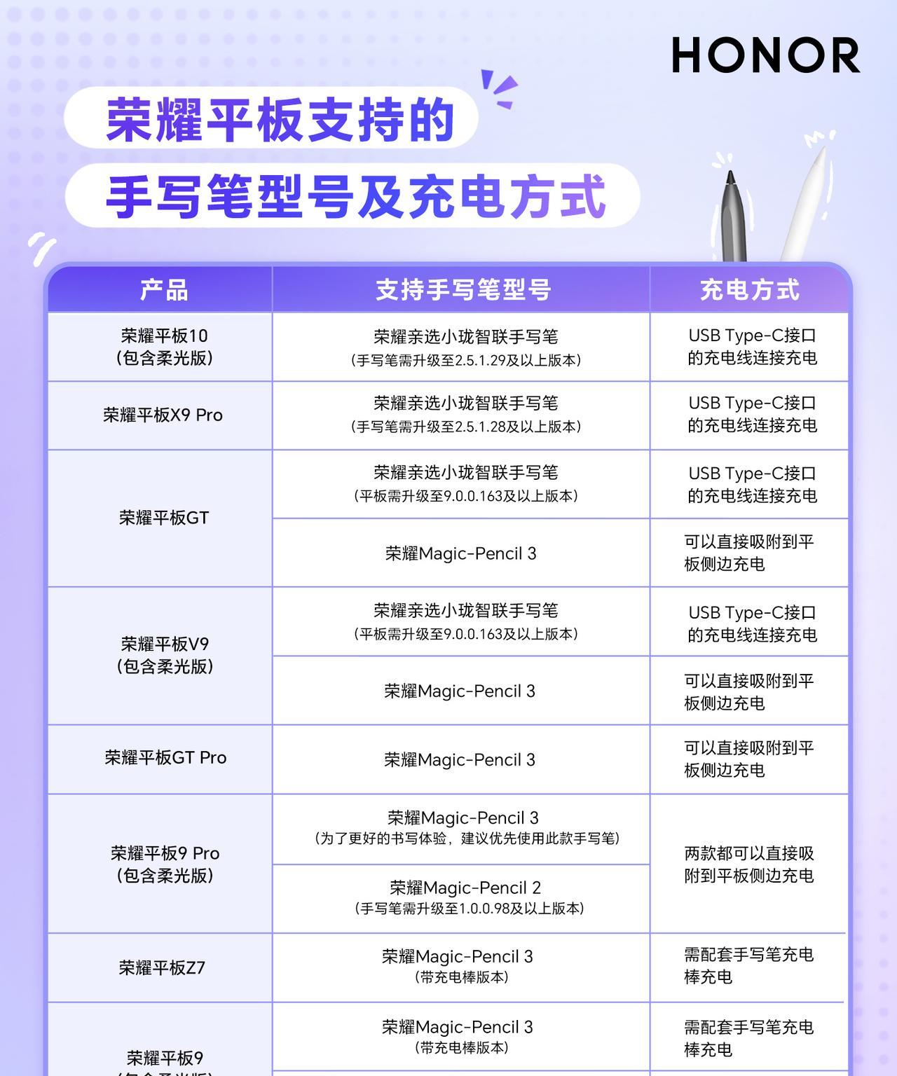 购买了荣耀平板之后,大家会利用这款产品做什么呢?很多朋友会刷视频、看课程、玩游戏、看电影等等,这只是其中的一方面,如果搭配手写笔之后,能实现从高效书写带来的与众不同的体验,当然对于喜欢绘画创作、笔记学习的朋友尤为重要。 真实纸质书写体验以及汇创创作得益于,手写笔的压感,以及接触类纸柔光屏带来的阻尼感,书写和绘画的还原摩擦感很还原。荣耀平板规格型号较多,荣耀客服利用一组图文,将荣耀平板产品的规格型号对应手写笔标型号注的很清晰,确实蛮实用。