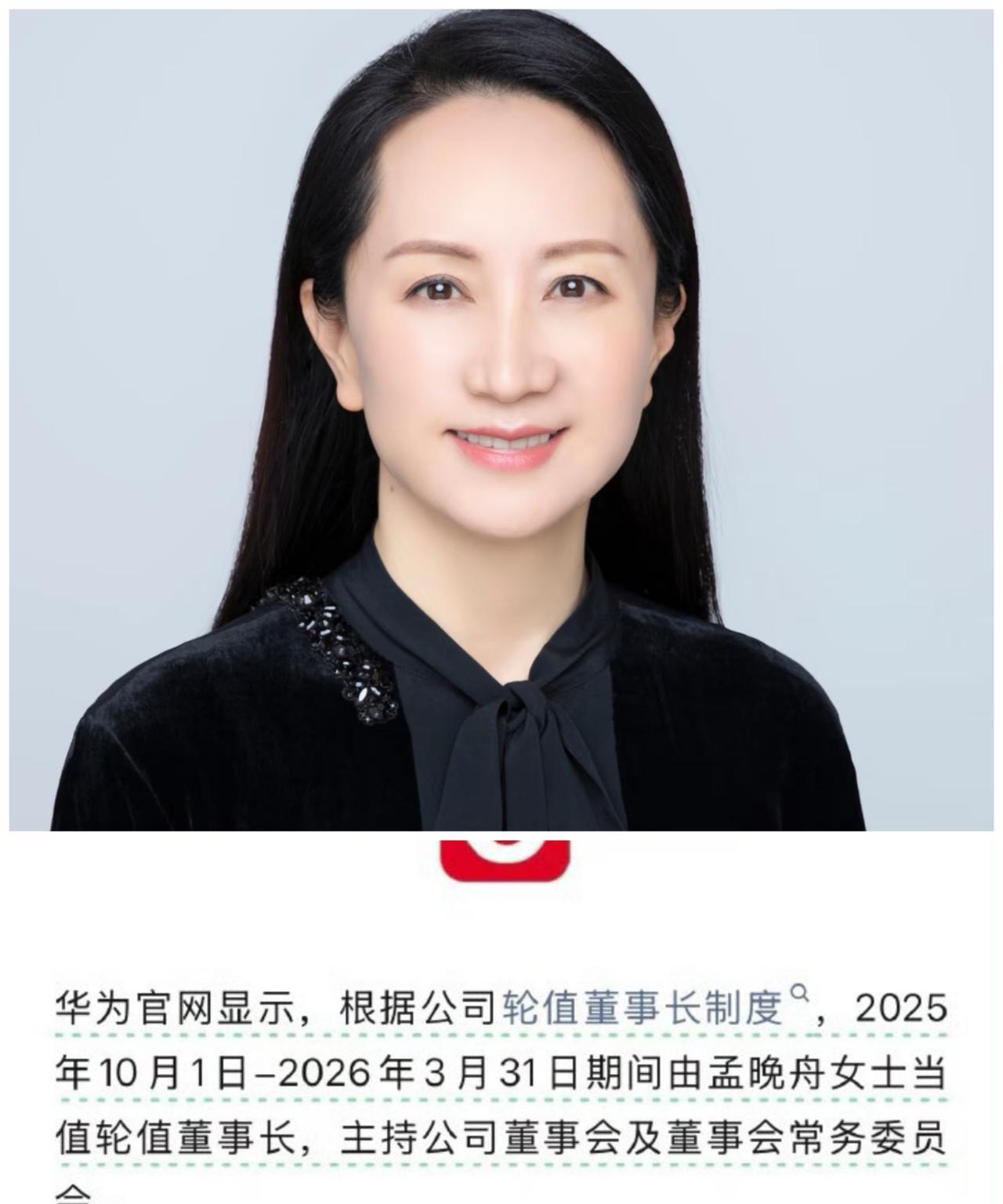 孟晚舟当选华为轮流制董事长, 从10.1号当到明年3.31号, 单凭孟晚舟女士的才干和魄力,华为肯定会蒸蒸日上, 孟晚舟是父亲的骄傲,也是华为的骨干栋梁,其实这不是孟晚舟第一次当华为董事长轮值,从23年开始就轮值了,