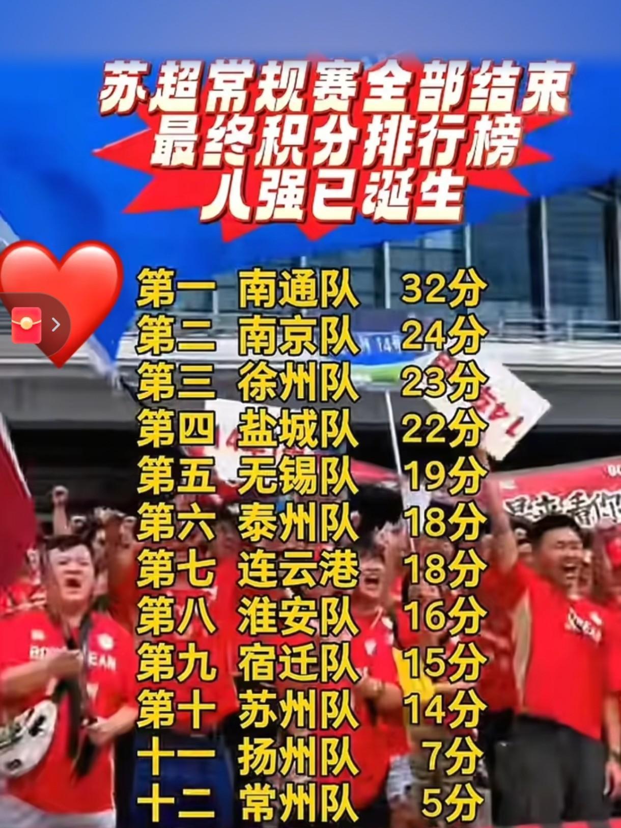 “苏超”2025赛季将于11.1日光棍节决赛!从目前参与淘汰赛的八支球队看,今年的冠亚季军已定,没有意外!那就是: 冠军:南通; 亚军:南京; 季军:徐州。 淘汰赛最大的梗就是:南京和南通,究竟谁才是真正的南哥! 第四名不出意外应该是盐城,连云港排名应该由目前的第七将至第八,“浪里马”淮安有望上升一名。