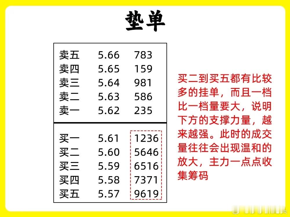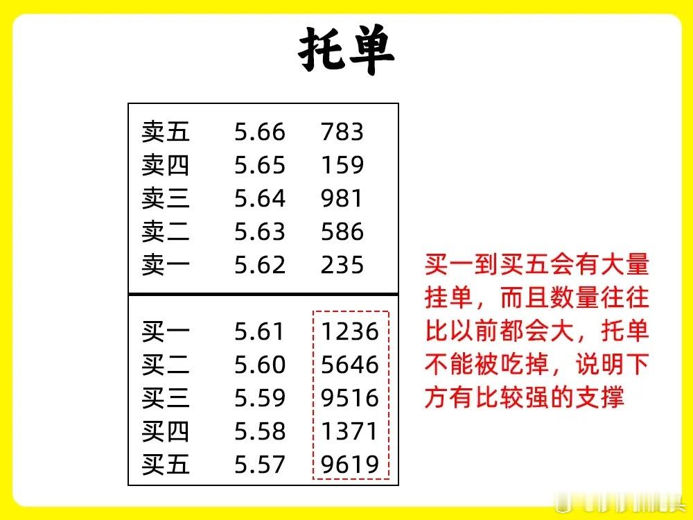 也叫买盘托单,股价在低位的时候,一般情况下,会在买一到买五会有大量挂单,而且数量往往比以前都会大,托单不能被吃掉,说明下方有比较强的支撑。此时成交量的表现就格外重要了,是缩量还是放量。如果股价在高位,那支撑的有效性就要思考了