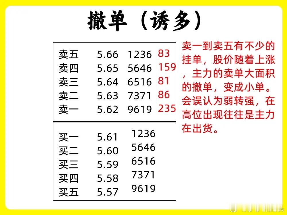 可以分成诱多和诱空两种。比如卖一到卖五有不少的挂单,股价随着上涨,主力的卖单大面积的撤单,变成小单。会误认为弱转强,在高位出现往往是主力在出货。