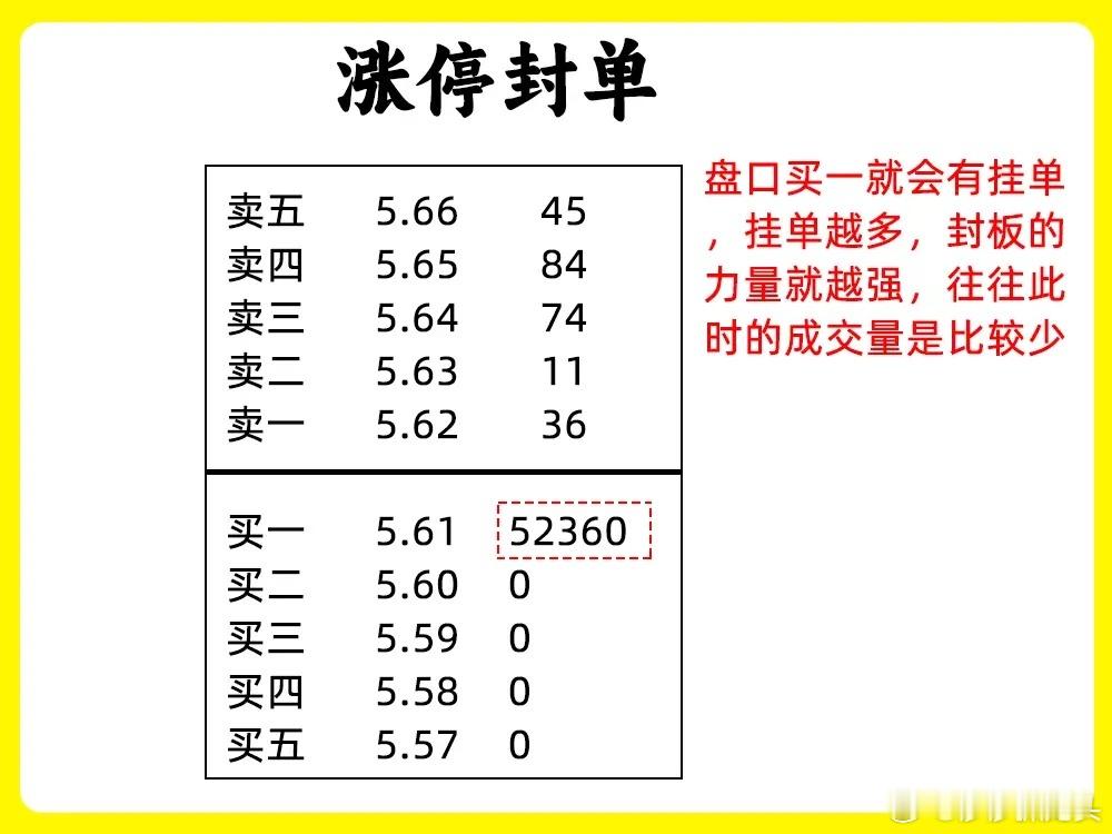 个股出现涨停,不管是实体涨停还是一字涨停,股价没有出现炸板回落,往往盘口买一就会有挂单,挂单越多,封板的力量就越强,往往此时的成交量是比较少的,这样的盘口一般会在股价低位或是上涨趋势的初期。相反的,股价跌停,卖一就会有不少卖盘力量,也就是抛压,一般出现股价高位或是下跌趋势当中。