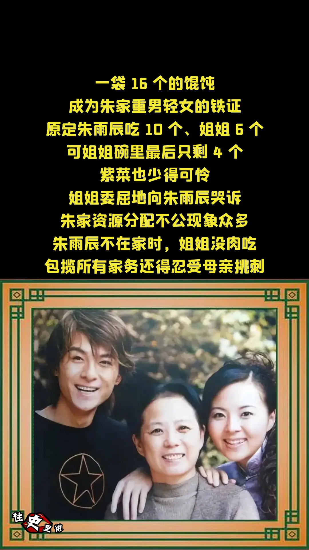朱雨辰说:“你知道我妈重男轻女到什么程度吗?一袋馄饨16个,本来说好我吃10个,姐姐吃6个,结果不知怎么回事,我的越吃越多。姐姐偷偷说,妈妈只给她盛了 4 个,其余全都给我了!”