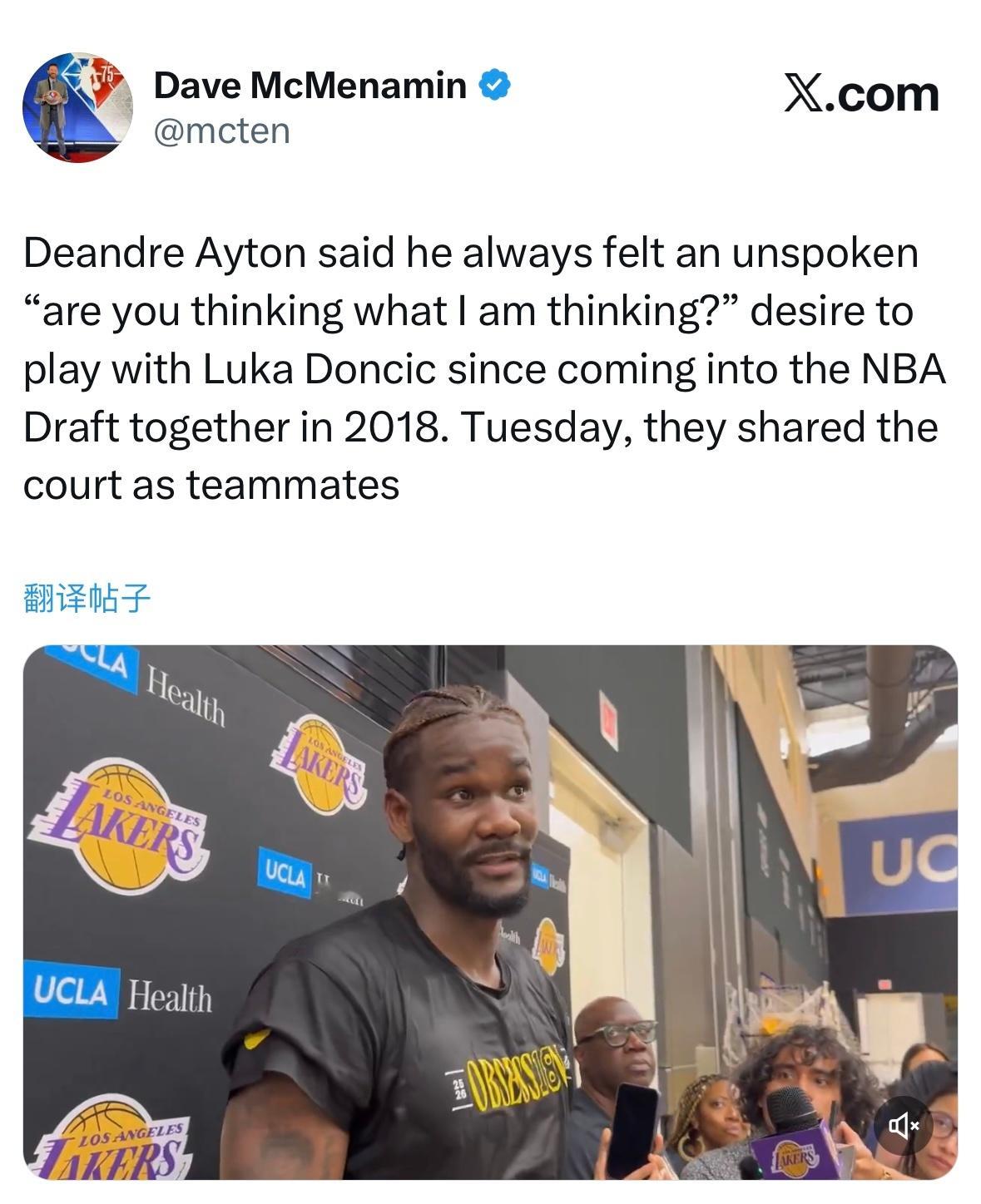 艾顿表示,自2018年两人一同参加NBA选秀以来,他就一直与东契奇有着一种心照不宣的默契——仿佛在问“你是不是和我想的一样?”,都渴望能成为队友。周二,他们终于以队友的身份一同踏上了赛场。