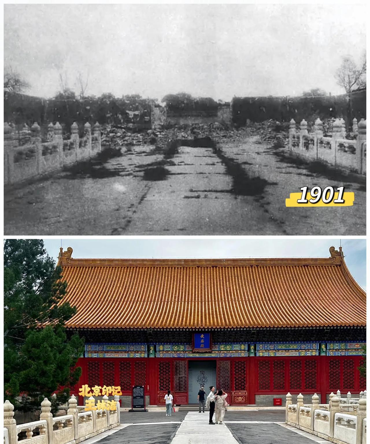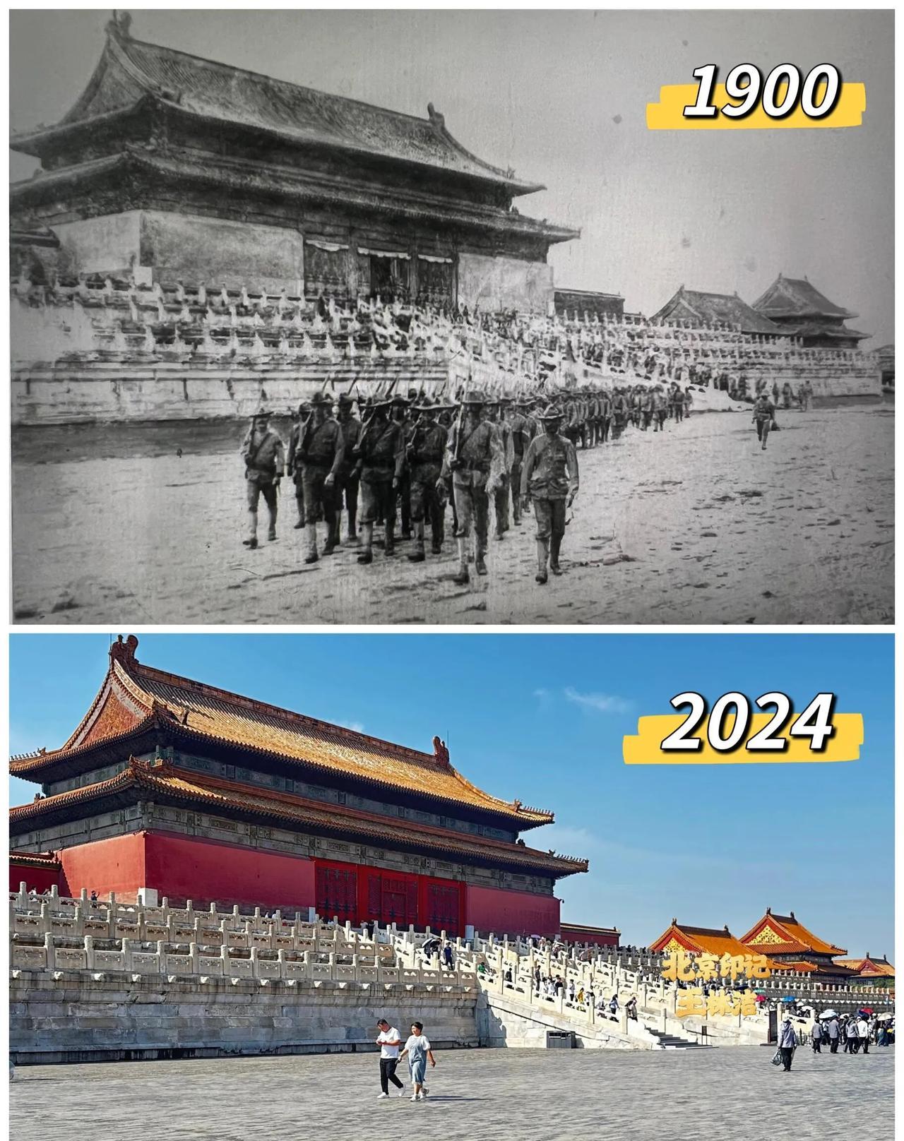 一图了解,故宫600年来最大的耻辱…… 故宫600年来最大的耻辱,当属八国联军攻入紫禁城这一事件。1900年,八国联军侵华,慈禧带着光绪等仓皇出逃。 彼时的紫禁城一片狼藉,乾清宫荒草丛生,曾经存放皇位继承人名字的地方没了往日威严;朝阳门荒废,河道淤积,百姓瘦弱艰辛;正阳门箭楼被焚毁,满目疮痍。 日本人还拍下罕见照片,洋兵像游客般把脚伸进大殿。这桩耻辱是历史的伤痕,提醒着我们铭记那段被侵略的过往,更要珍惜如今国家的独立与强大。 图:八国联军攻入紫荆城古今照片对比。#故宫# #紫禁城博物院# #故宫照片# #紫禁城# #八国占领北京城# #明朝故宫# #故宫图案# #清朝历史故宫#