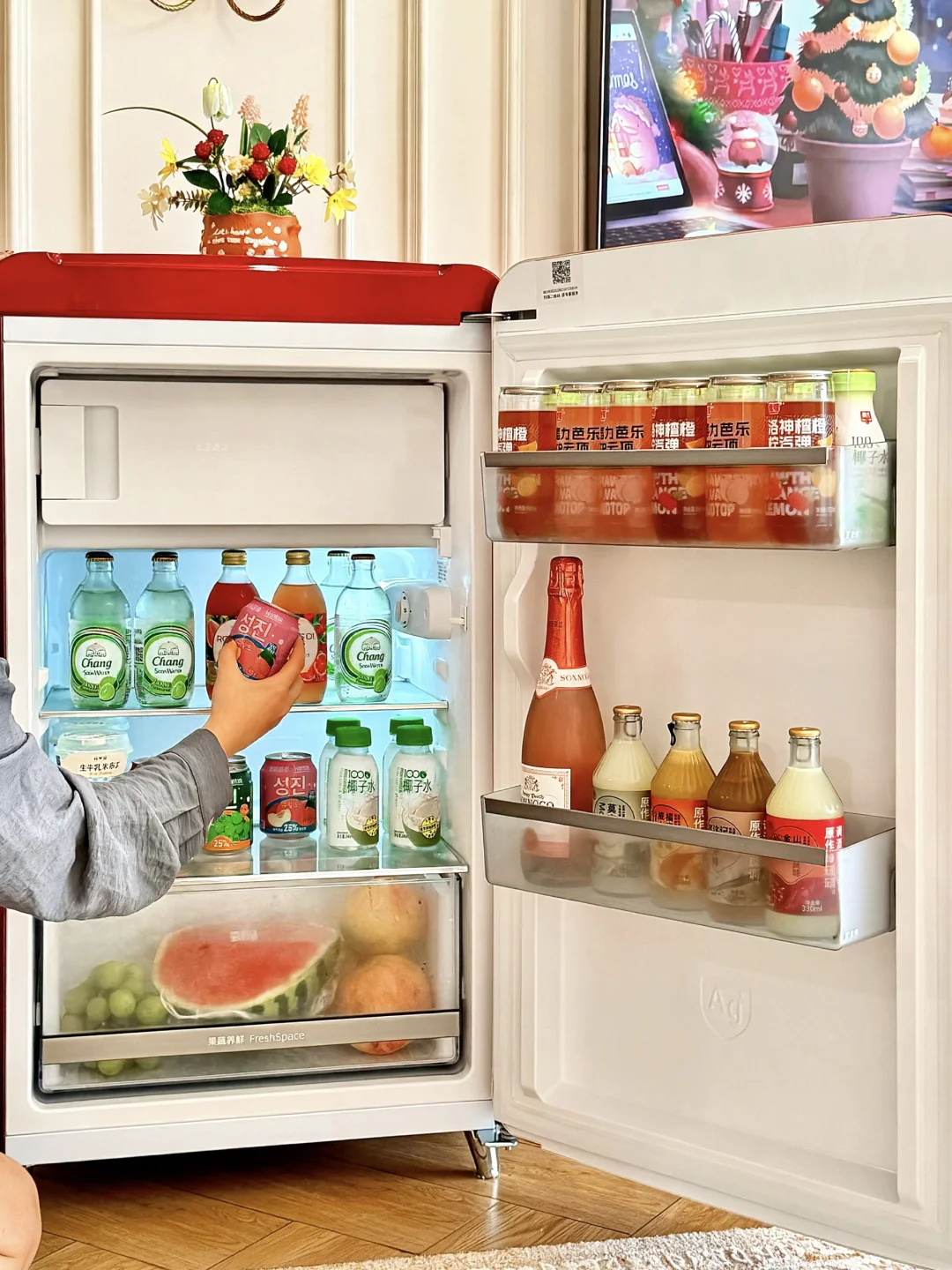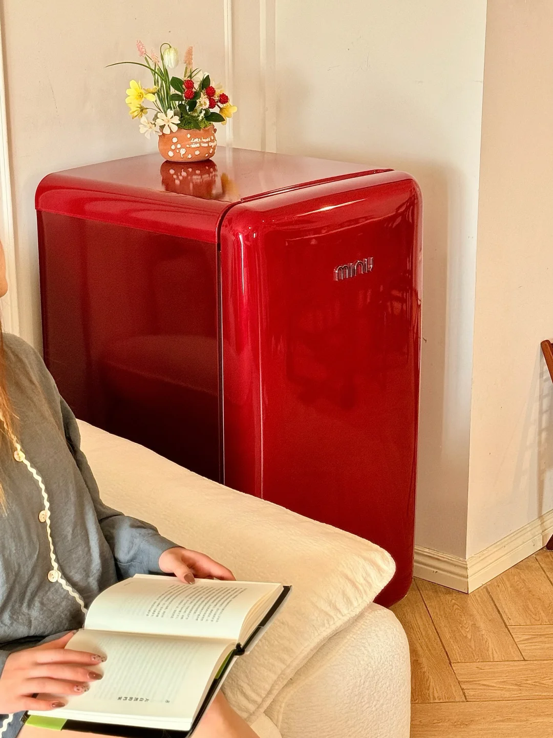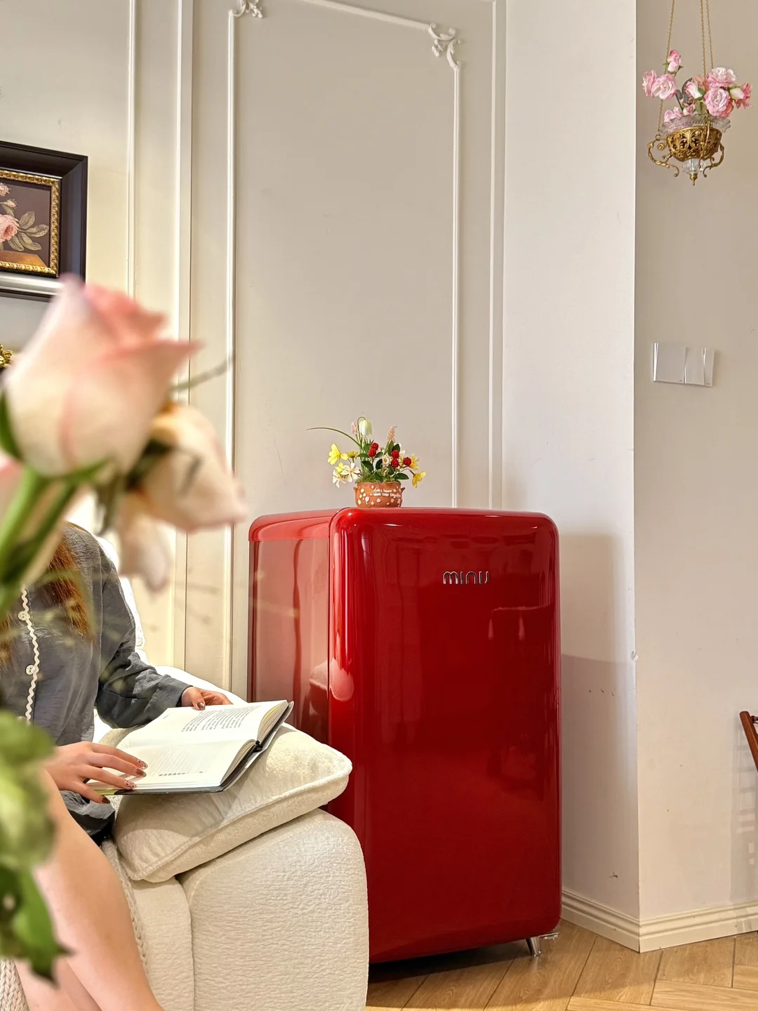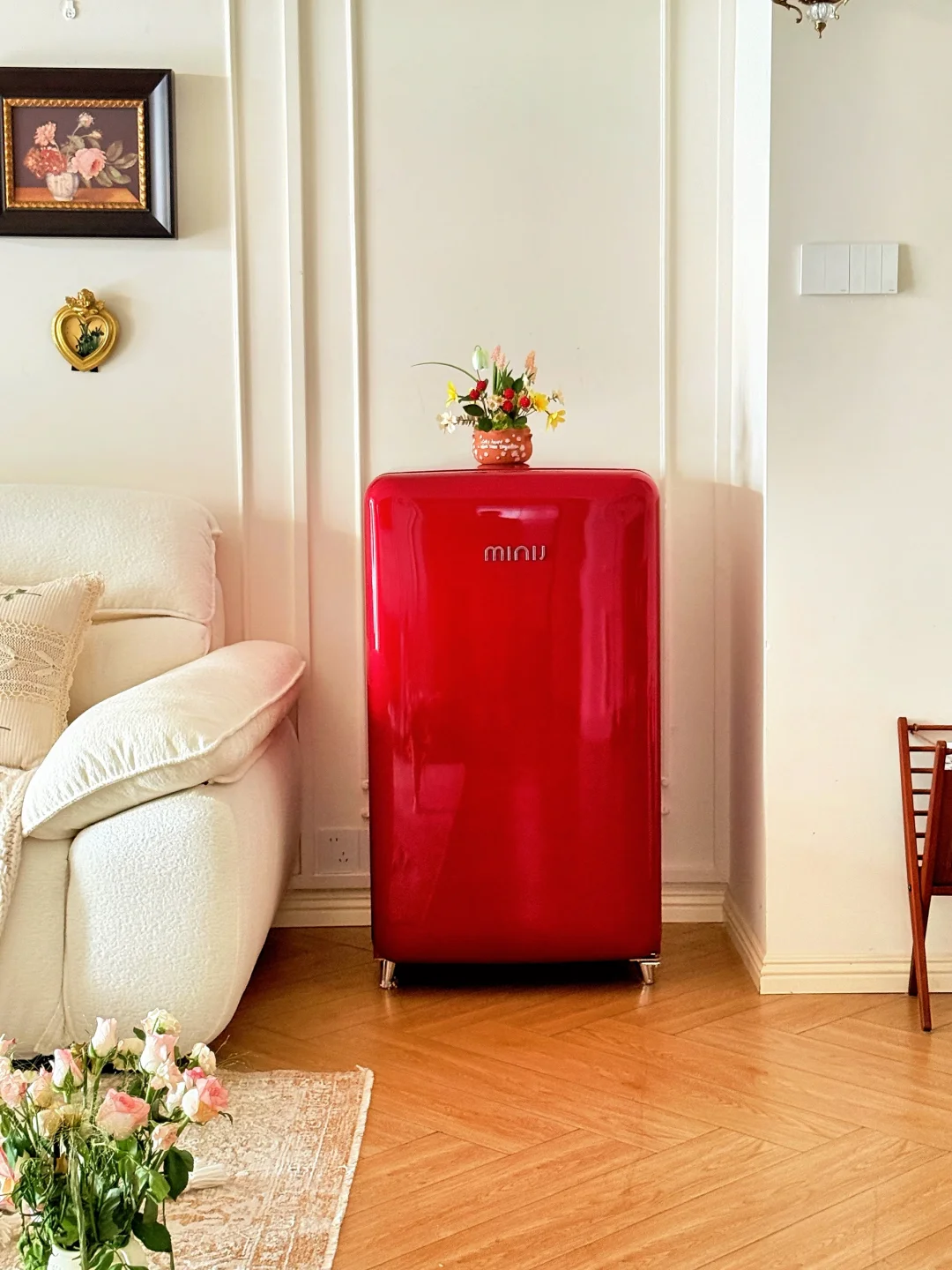 连沙发边都安排了一台小吉复古冰箱,
