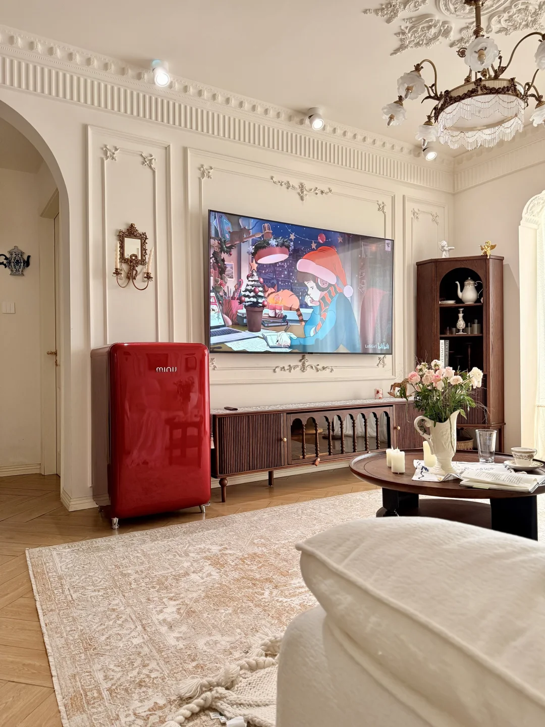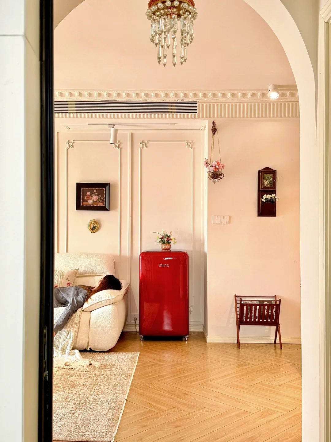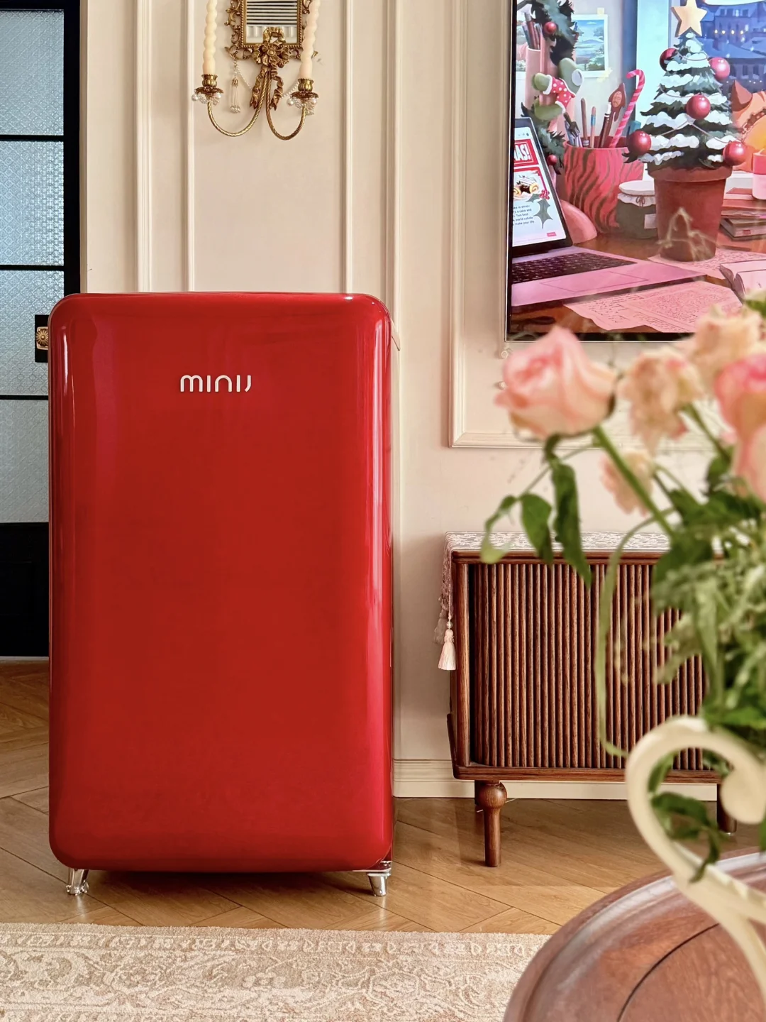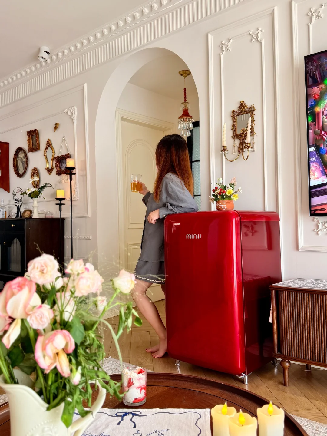 连沙发边都安排了一台小吉复古冰箱,