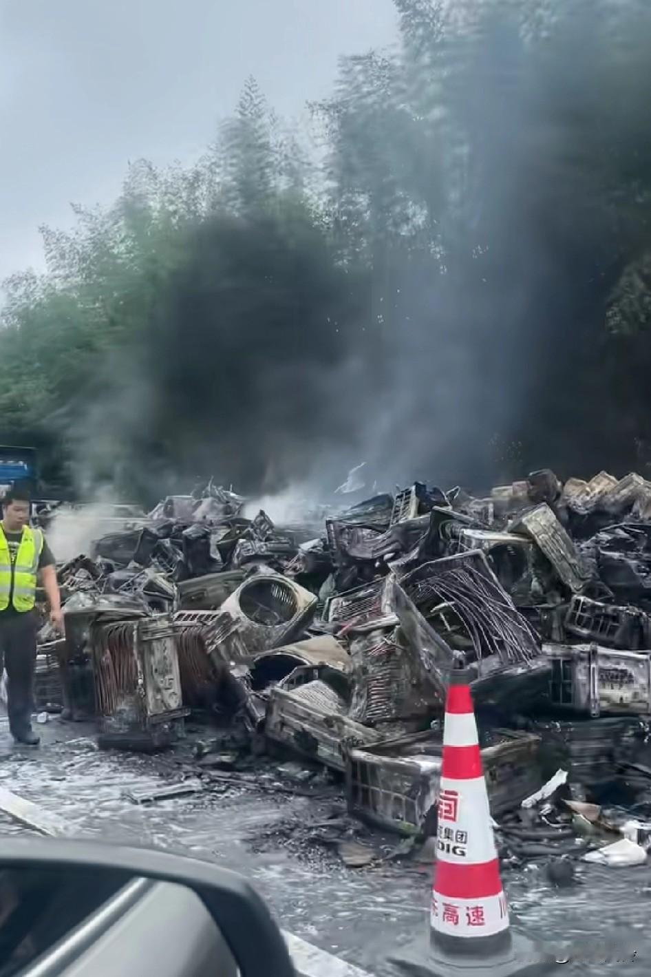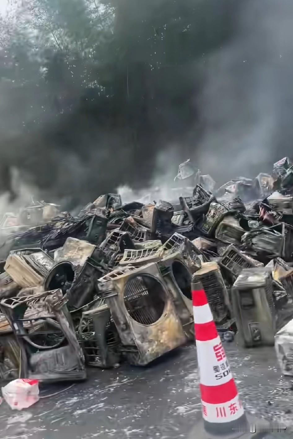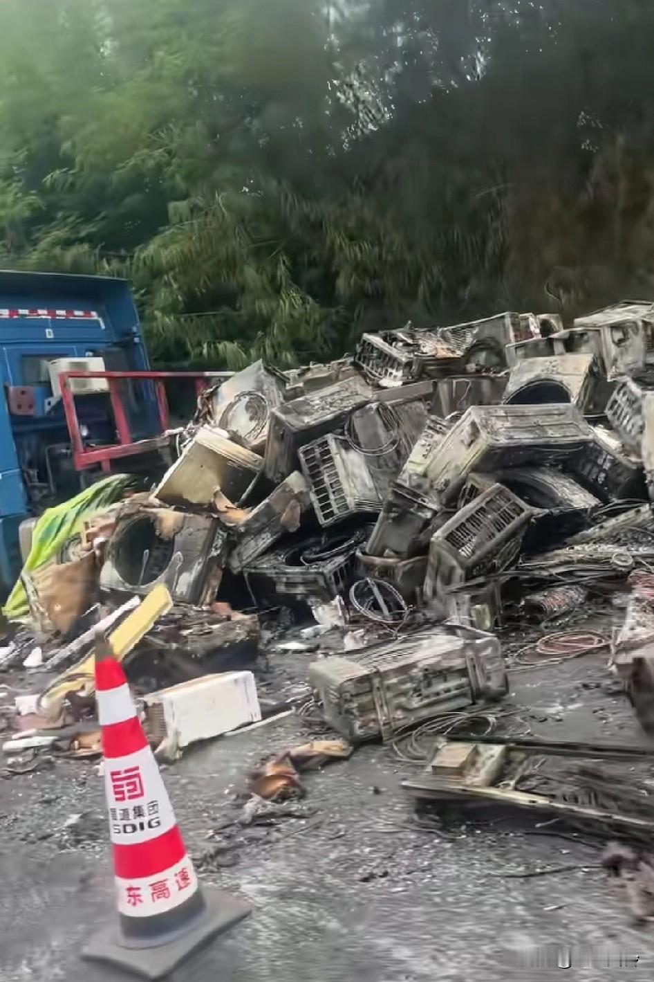 高速上美的的空调烧完了! 好多铜管,质量还是不错的,厂家又要加班了吧? 百分之百抽烟扔出去扔到空调上去了,然后把包装箱引燃了。单位以前送货的司机,安装工都在车上,不知道谁扔的烟头出去吹到车上去了就燃起来了。一车空调好几十W