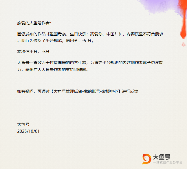 10月1日,是伟大的中华人民共和国76岁的生日,怀着一颗赤子之心,我在各个平台都简单地发了一段祝祖国生日快乐,我爱你中国的话(本平台也发了)。令人十分意外和愤怒的是,因为这几句话,本号在大鱼号被罚。 而在其他平台,都毫无问题。 本号还给了大鱼号客服发了申诉,希望有一个合理的解释,然而,一段时间过去了,石沉大海。 这是什么平台?这是谁的平台?怎么还能与这样的平台合作?这样的原则问题还能忍吗? 在此,本号宣布:永久退出“大鱼号”。