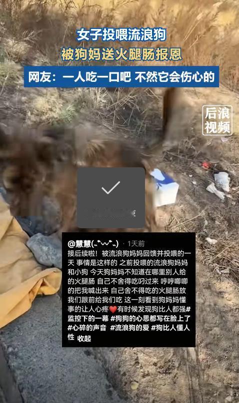 近日,新疆一流浪狗跑到曾投喂过它的女子面前,本以为它是来索要吃的,没想到,小狗竟然把不舍得吃的火腿肠放在地上,后退两步默默的看着女子,原来它是想要回报女子,而女子接下来的举动,让人意外,网友:高低吃两口吧,别寒了小狗的心! 李女士家里经营着一家小超市,平日里总能见到附近的流浪猫狗在街角闲逛。 她性格善良,看到它们饿得瘦弱、无家可归,总会顺手拿点火腿肠、面包或剩余的零食投喂,久而久之,附近的小动物们也对她渐渐熟悉,常常远远看到她出来就摇着尾巴或蹭蹭地跟过来。 那天早晨,李女士正整理货架,突然注意到门口附近出现了两只新的流浪狗,仔细一看,原来是一只母狗带着自己的小狗,看起来瘦弱而憔悴。 两只小狗饥饿得在垃圾桶边翻找残羹剩饭,小小的身体不停地抖动,鼻子顶着桶沿,发出轻轻的哀鸣。 李女士的心顿时一紧,放下手里的活儿,走到门口。她蹲下身,从袋子里拿出一些剩余的面包和火腿肠,轻轻地放在小狗们的面前。 母狗警惕地看了她一眼,但嗅到食物的香味,慢慢靠近,把头伸向食物,小狗见状也踉踉跄跄地跑过来,急切地啃起食物,狼吞虎咽的样子让李女士心里既心疼又欣慰。 她微笑着,蹲在一旁,看着小生命们满足地吃着食物,心里涌起一股暖意,两只小狗吃完之后,他们就离开了,李女士也回了店里。 那天午后,李女士正忙着理货,突然,她听到店门口传来轻微的响动,像是爪子摩擦地面的声音,她抬头一望,顿时愣住了,正是前几天见过的那只狗妈妈。 只见狗妈妈嘴里小心翼翼地叼着一根火腿肠,它慢慢走到李女士的跟前,把那根火腿肠轻轻放在了地上,然后缓缓退后两步,静静地望着她。 李女士鼻头微微一酸,心头涌起一股说不出的感动,她缓缓蹲下身子,先是伸出手轻轻捡起那根火腿肠。 可李女士并没有把这火腿肠留给自己,她笑了笑,反而当着狗妈妈的面,把整根火腿肠掰成了一小块一小块,然后,她一块一块地递到狗妈妈嘴边,狗妈妈先是迟疑了一下,随即轻轻叼起。 这个处理方式,既尊重了狗狗的情感,又照顾了它的实际需求,简直是智慧和温柔的完美结合。 善良需要用正确的方式表达。面对流浪动物,我们可以保持距离,提供干净的食物和水,但最好不要轻易触摸,如果发现它们受伤了,及时联系专业的救助机构才是最有效的帮助。 信息来源:后浪视频