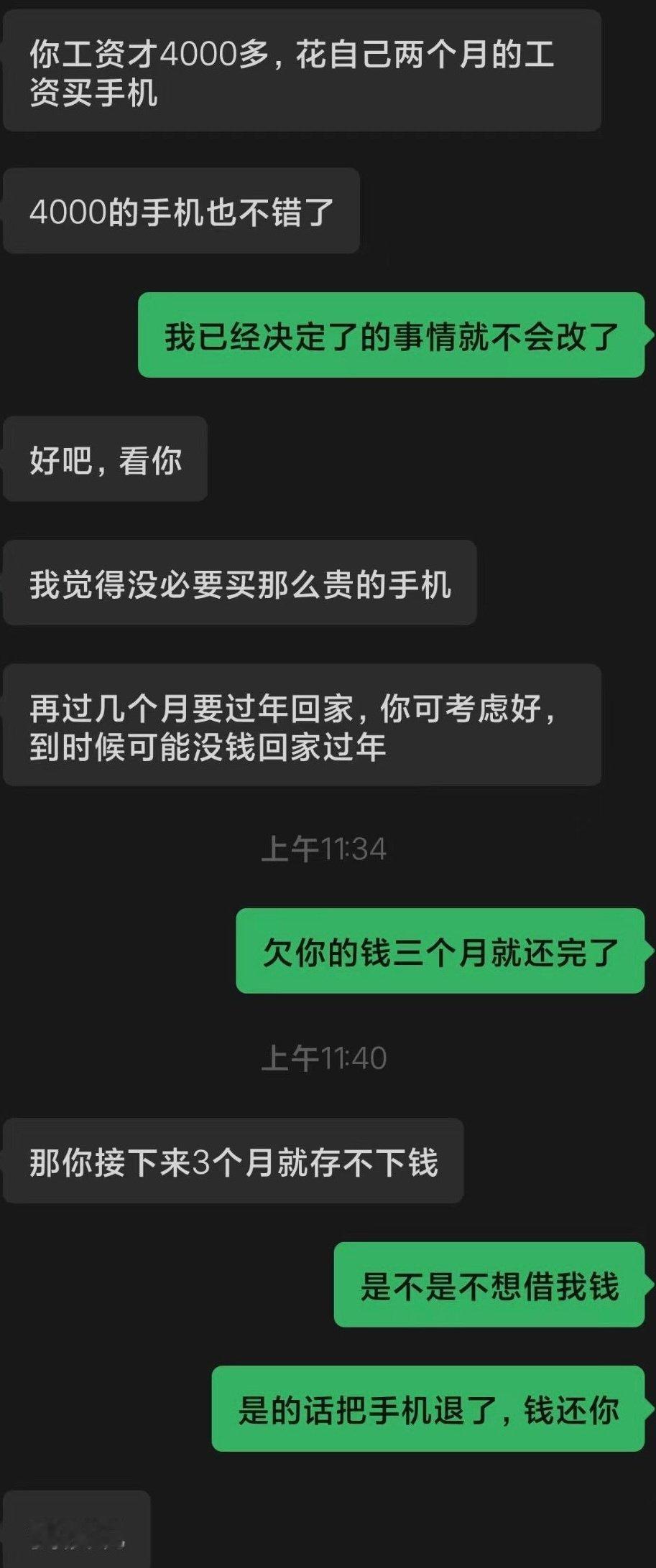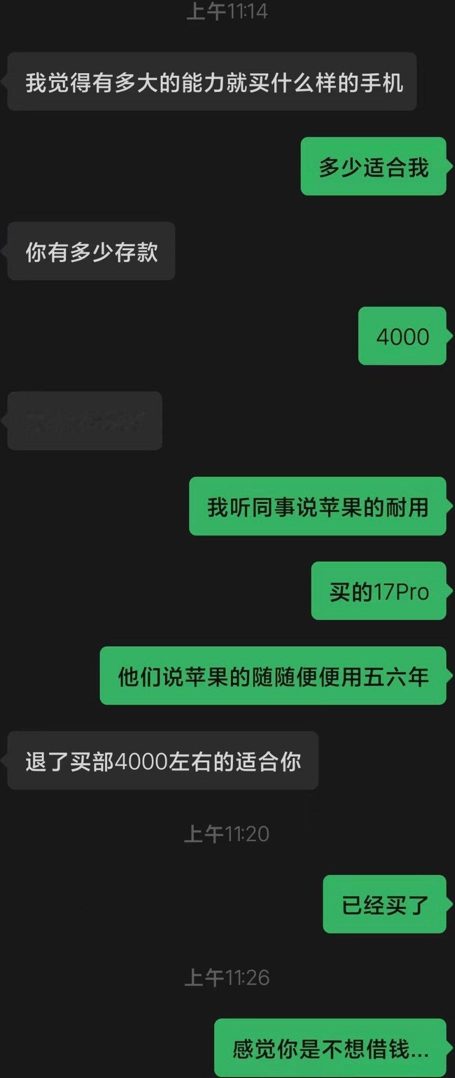 我的手机是4年前买的一部安卓机,在当时买了5千多,用了4年才开始卡起来,我听说苹果手机更耐用,想买一部17pro,我看价格要8999,我的存款还不够买,想用男朋友存在我这里的钱买来先用着,等我后面两个月发工资还他,这没有什么太大的问题,他的钱存在我这里也不用,我先用了再慢慢还他,他却很生气要我把钱还他分手
