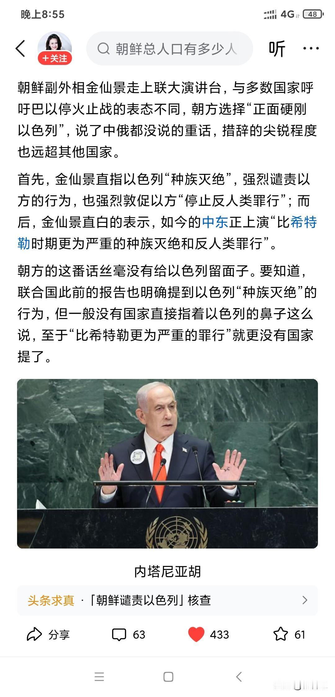 厉害了,硬核:朝鲜副外长金仙景在联合国大会上斥责以色列“种族灭绝”,强烈谴责以方的行为,也强烈敦促以方“停止反人类罪行”;而后,金仙景直白的表示,如今的中东正上演“比希特勒时期更为严重的种族灭绝和反人类罪行”。 朝鲜有核,导弹比以色列强的不是一点点,比伊朗军事还强大,内部团结,对外封闭,以色列的摩萨德情报人员根本无法渗透!这次以色列又惹了众怒,他跟以色列又没有经济,军事,科技,教育,农业联系!所以朝鲜根本不会惯着它,以色列的短板就是远程作战,所以真理在大炮的射程范围之内。以色列也拿朝鲜没办法。 世界上就应该有朝鲜这样的国家,敢说真话,不怕美帝和他的以色列爸爸。在联合国敢这样说真话的国家真不多。向朝鲜人民民主共和国致敬。向朝鲜人民致敬!