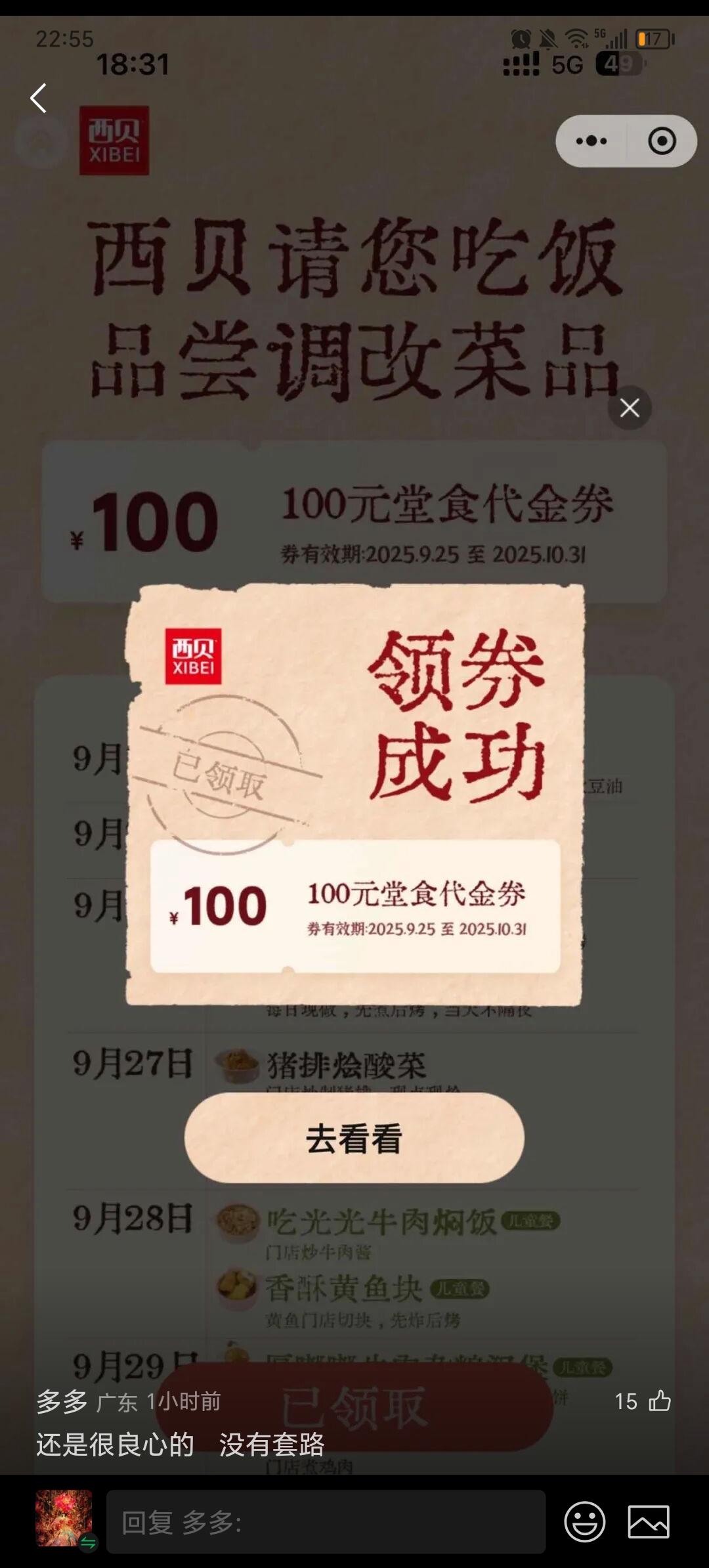 西贝降价了! 西贝发券了!大额券100元!使用时间到10月31号! 部分菜单