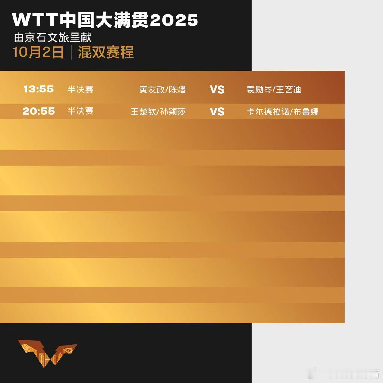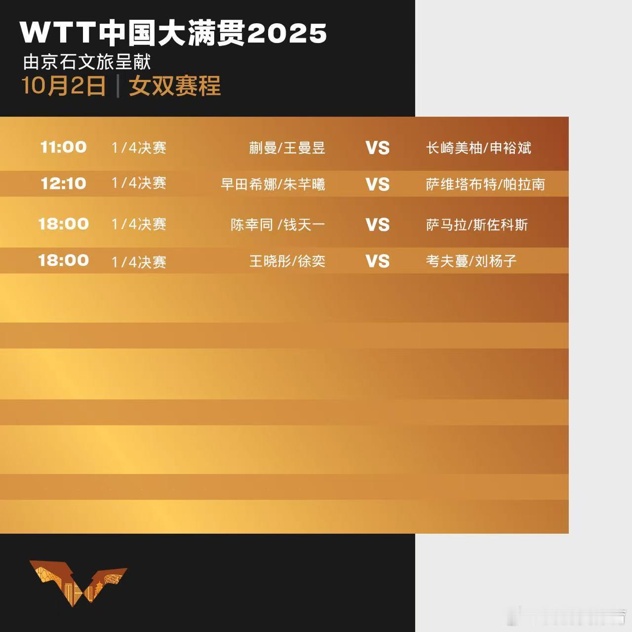 wtt中国大满贯202510月2日赛程中国乒乓球梦之队[超话]