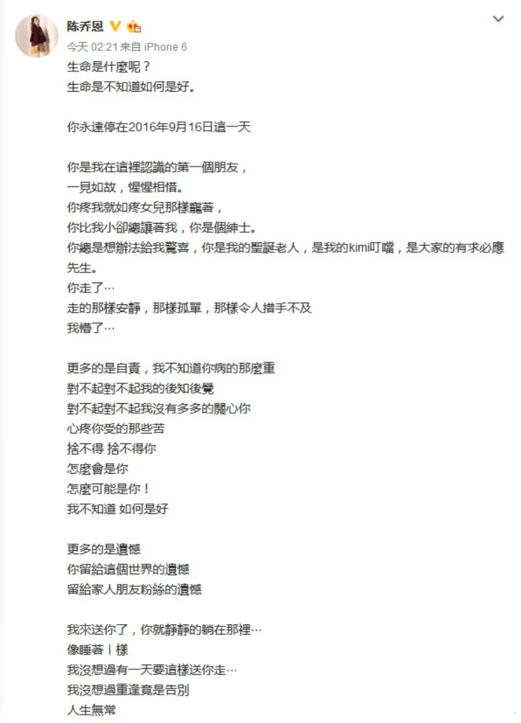 他去世以后,是他们帮着料理后事,安慰乔爸乔妈破碎的心,让他们知道,人世间还是有美好与爱的存在。陈乔恩每年都会去看乔任梁,还带着艾伦一起去看,从前是乔任梁总是给她惊喜,现在换她照顾他了[可怜R]