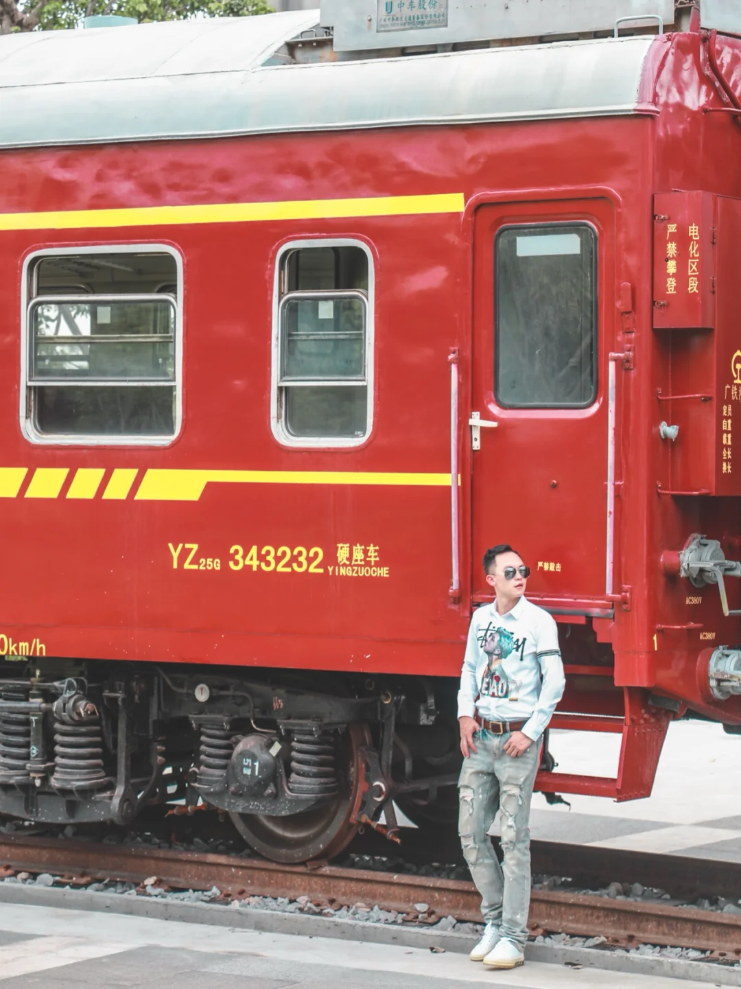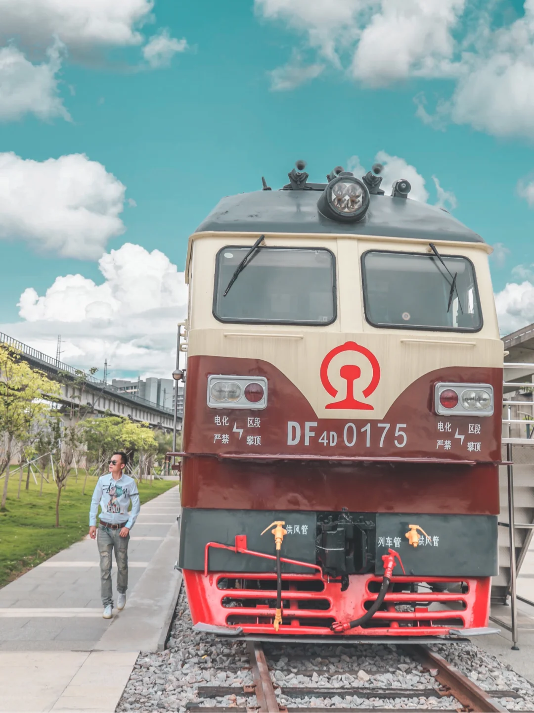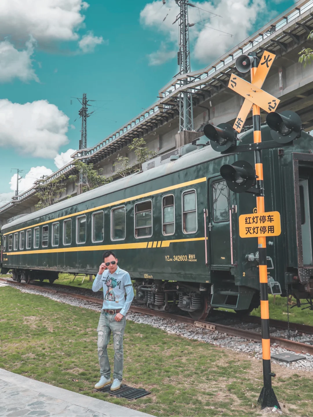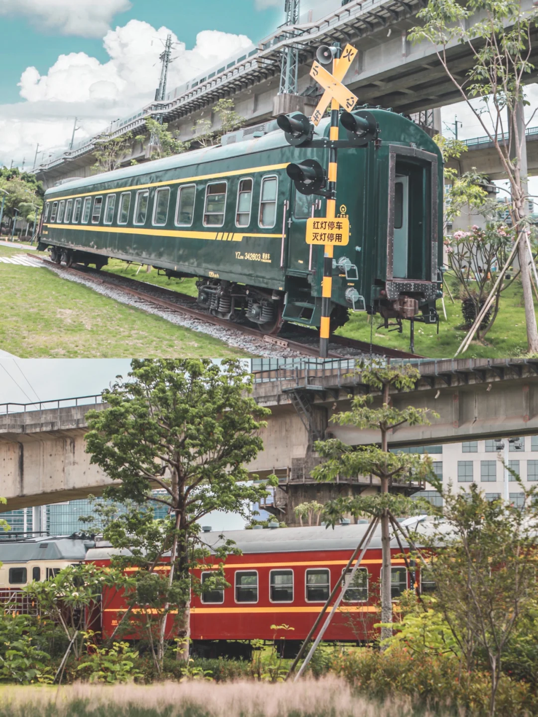 1⃣️最喜欢在绿皮火车前的红绿灯那里拍照,最好上面有高铁飞驰而过,高铁、火车同时入镜太酷了!