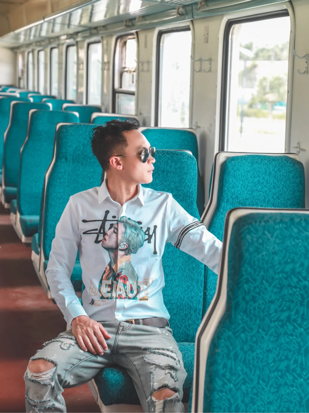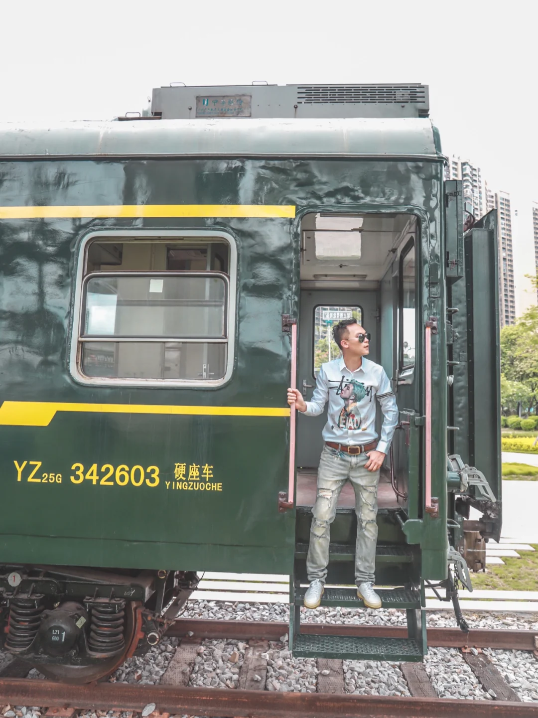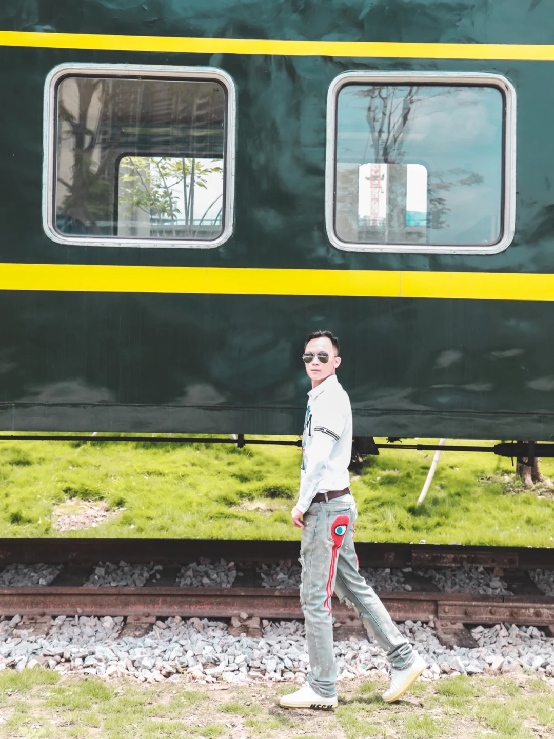 4⃣️走在绿皮火车旁,以车窗作为背景,勉强叫做送别吧
