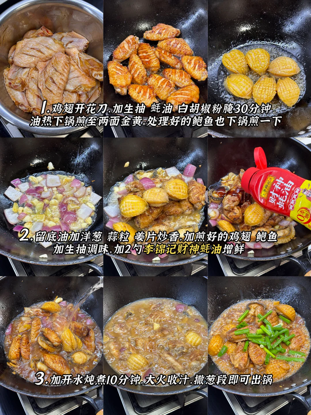 🌟鸡翅烧鲍鱼:鸡肉软嫩,鲍鱼弹牙,一口下去鲜掉眉毛 !♥️李锦记财神蚝油为这道菜增色不少,它是鲜熬型蚝油,新鲜生蚝即采即熬,独门的古法熬煮工艺,浓醇蚝鲜让整道菜鲜味儿超足,鲜得更有层次,也更容易入味~