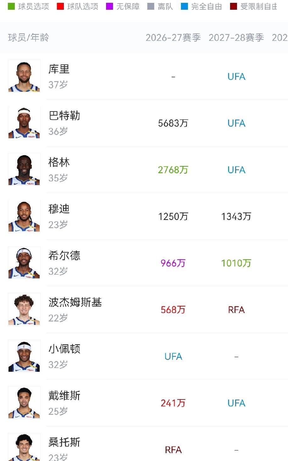 两年后,勇士队连五个首发都凑不够了! 今天在搞定了库明加的两年合同后,勇士队也正式签下了霍福德、小佩顿、小库里和梅尔顿等人。 由于库里、格林和巴特勒的合同都是在两年后到期,所以勇士队给别的球员开出的合同都基本上控制在两年之内。 小佩顿一年330万,小库里一年230万,梅尔顿一年308万,霍福德两年1200万,库明加两年4850万。加上库里、格林、巴特勒、波杰姆斯基、TJ戴维斯、桑托斯、波斯特等人,两年之内勇士有十二个人合同到期。 两年后,勇士队连五个球员都凑不齐了,将要迎来全面的洗牌!#NBA# #NBA吐槽大会# #NBA睿闻#