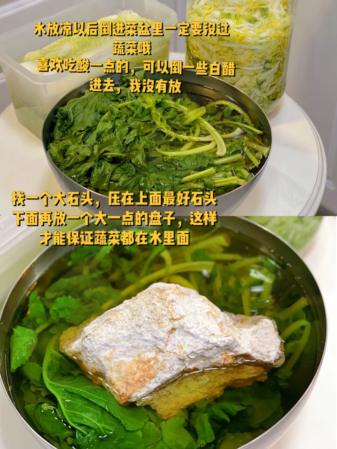 5. 找一个大石头,压在上面最好石头下面再放一个大一点的盘子,这样才能保证蔬菜都在水里面