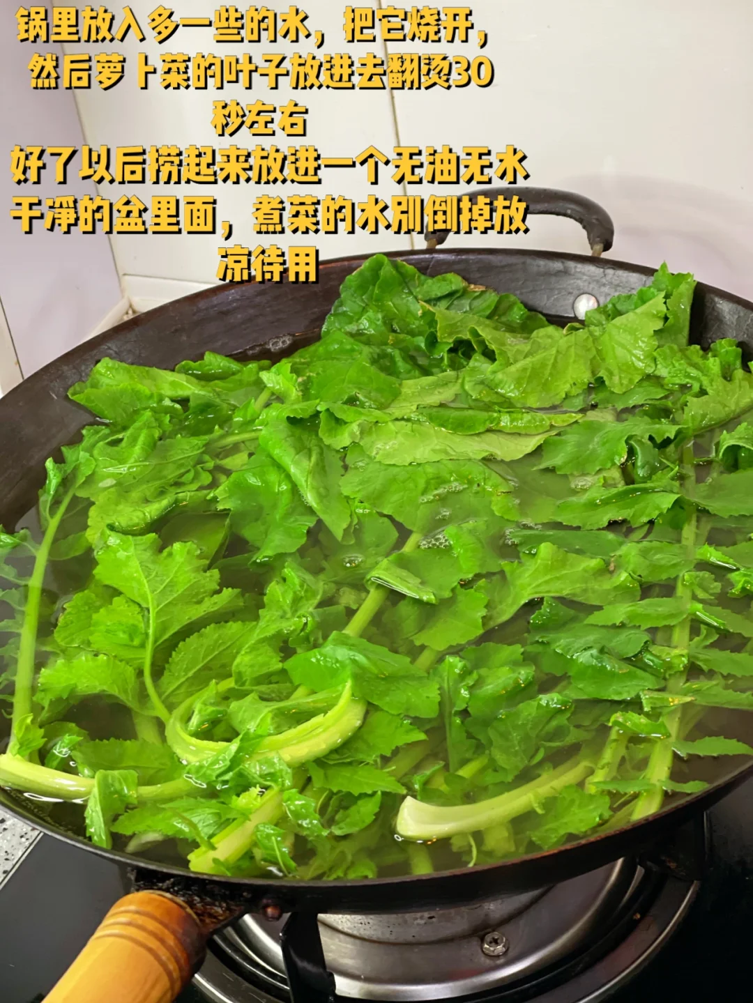 2. 锅里放入多一些的水,把它烧开,然后萝卜菜的叶子放进去翻烫30秒左右